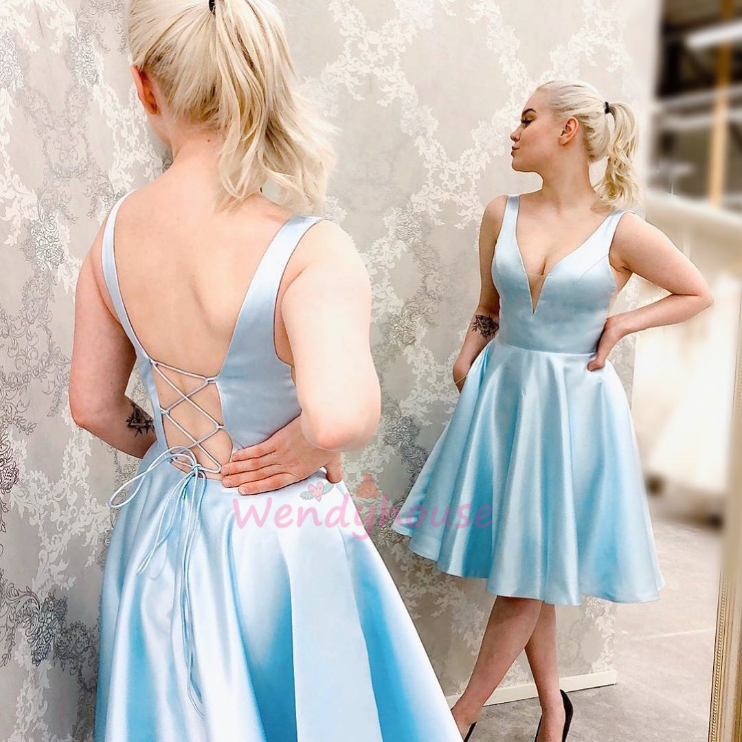 Short light blue prom dress features with v necline, lace up back and above knee length.