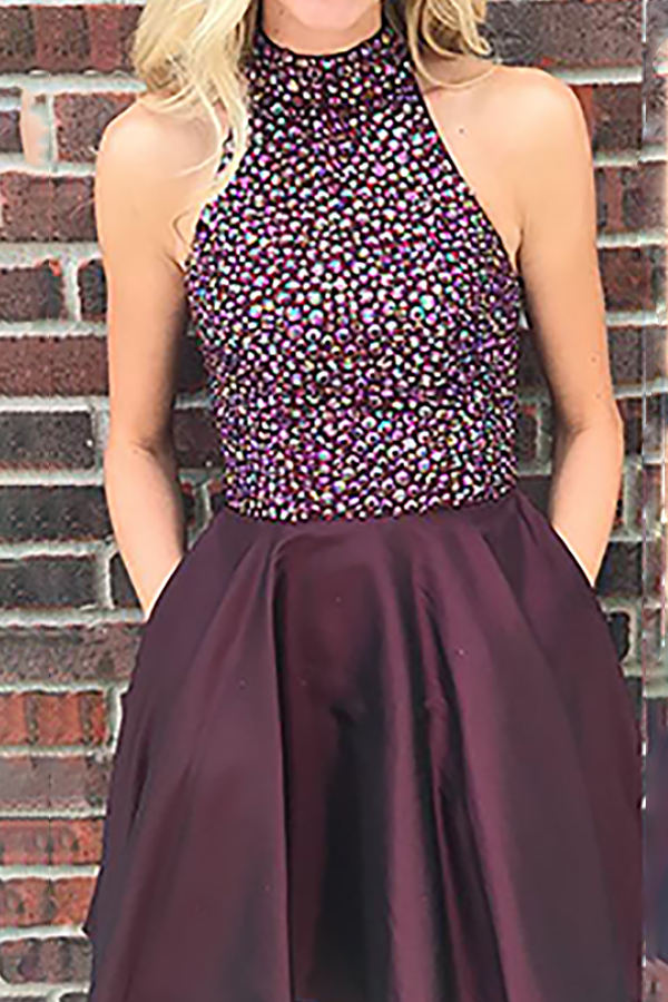 Purple Backless Beaded Short Homecoming Dress with Pockets