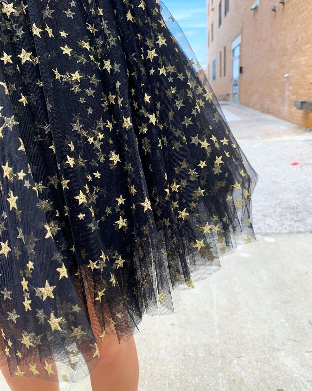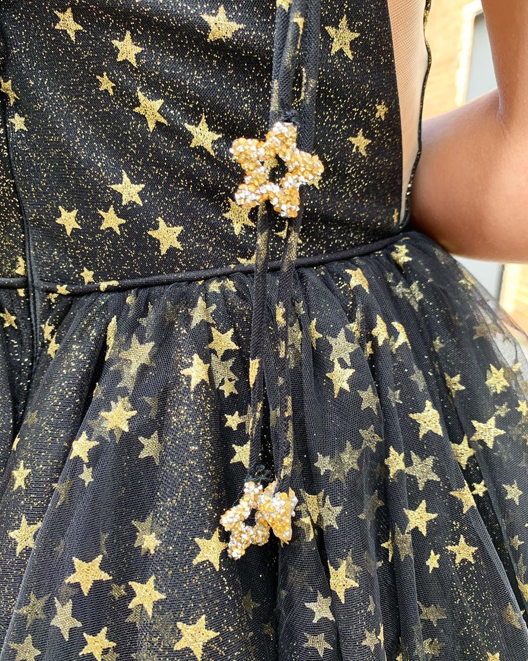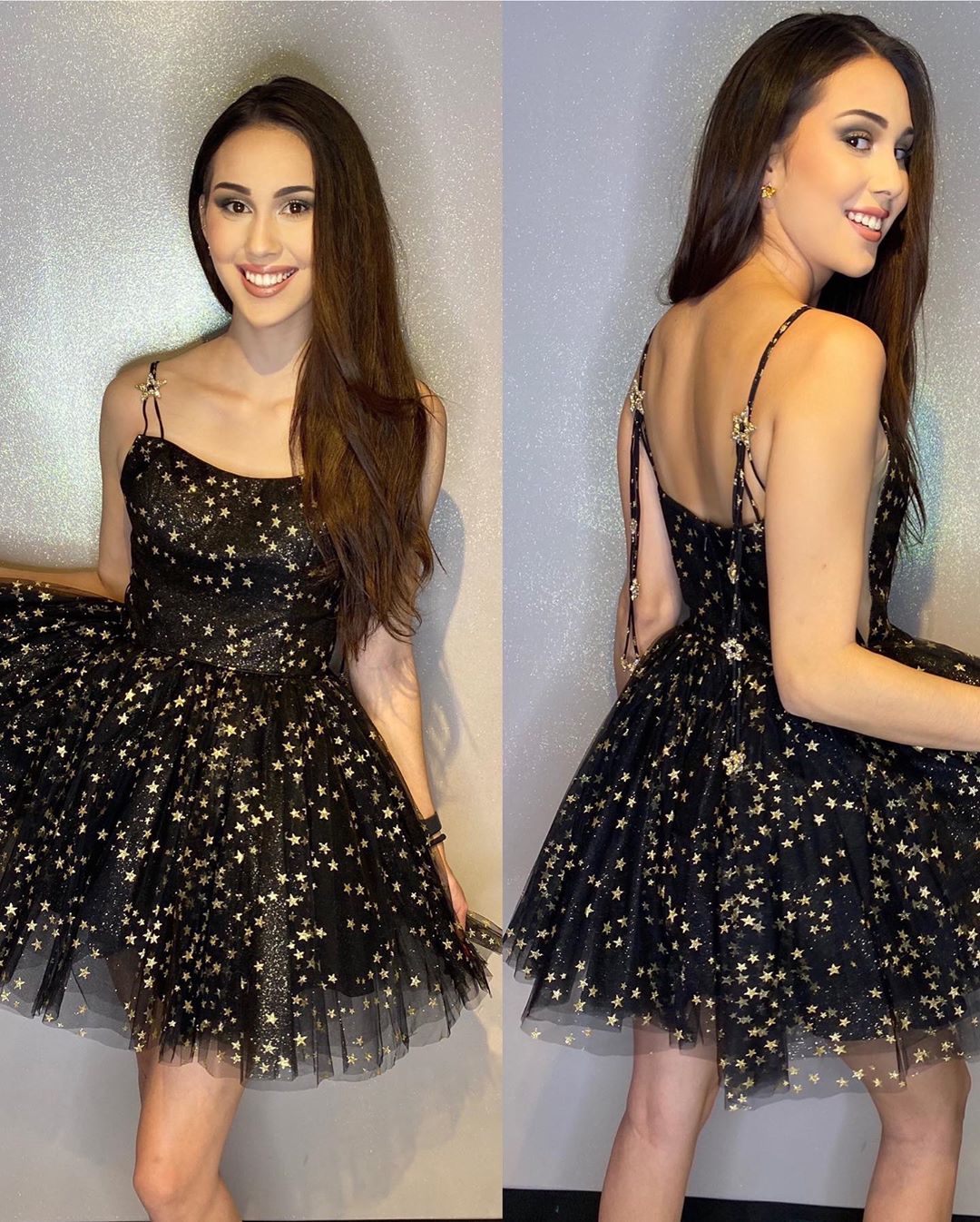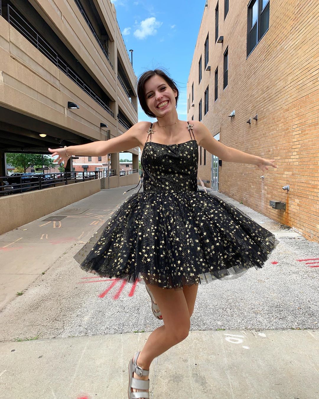 Wendyhouse A-line short black homecoming dress with gold sequins.
