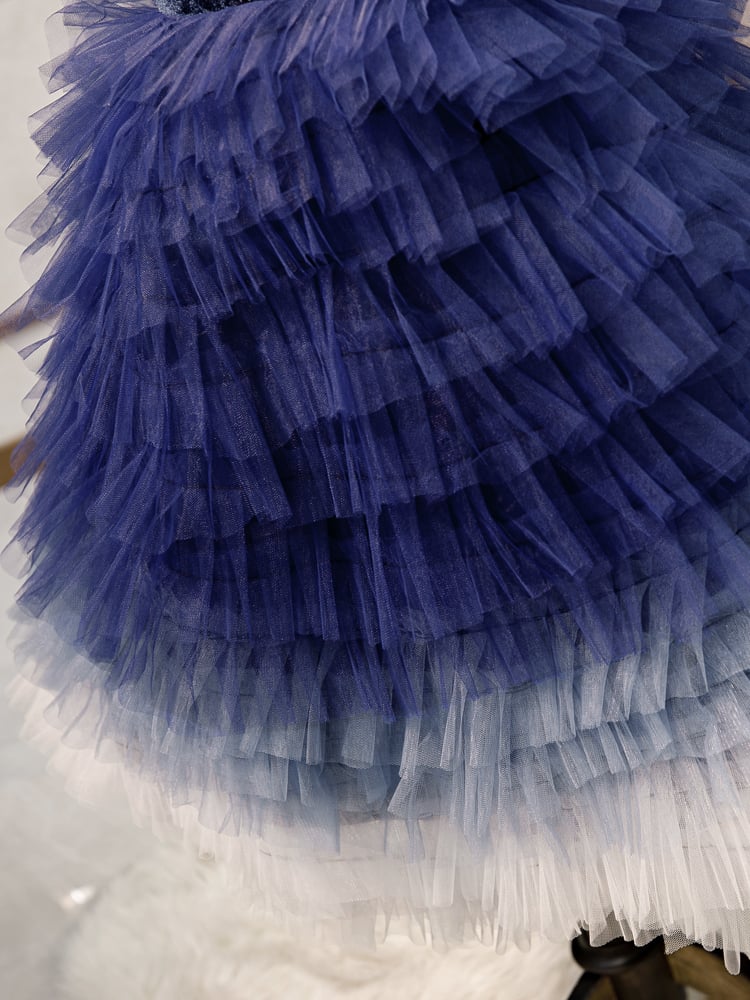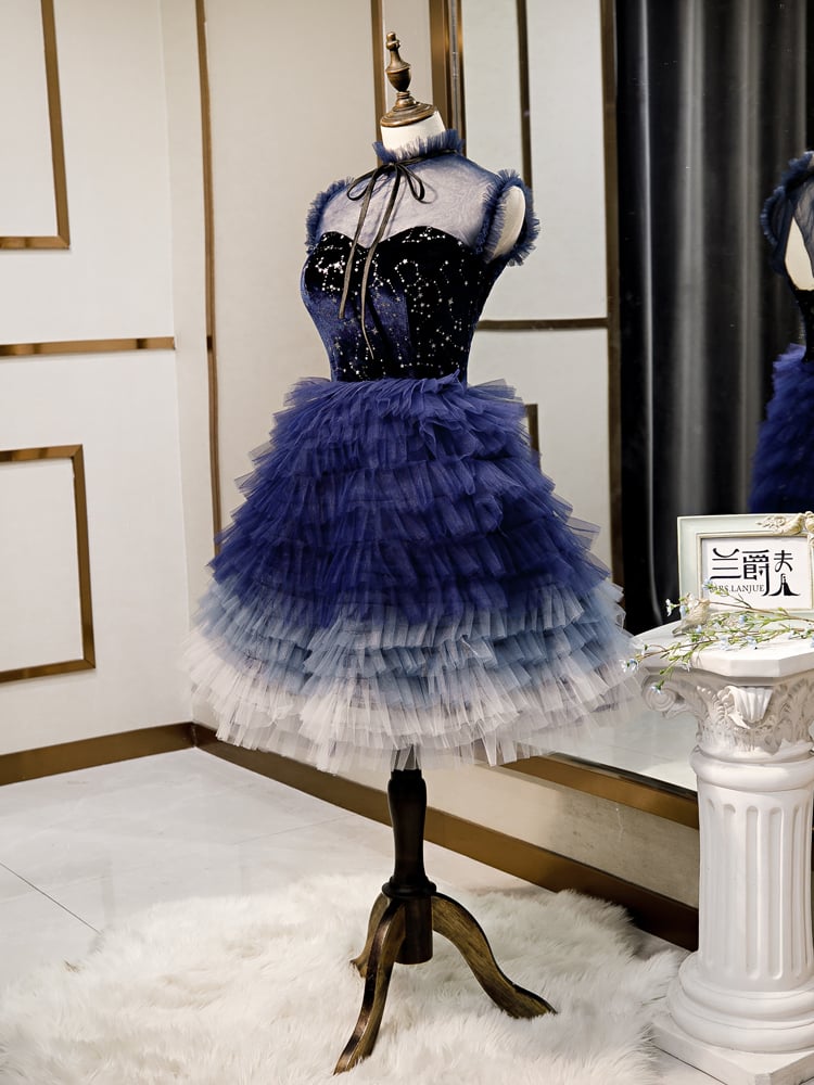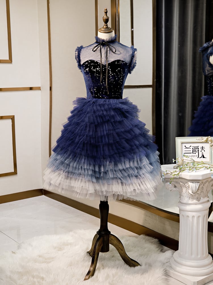 Wendyhouse special A-line short high neck navy blue tiered party dress with open and lace up back.