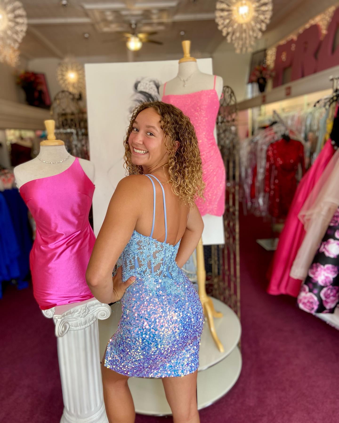 Sparkle blue sequin bodycon mini dress features v neck, see through stomach and zip up back.