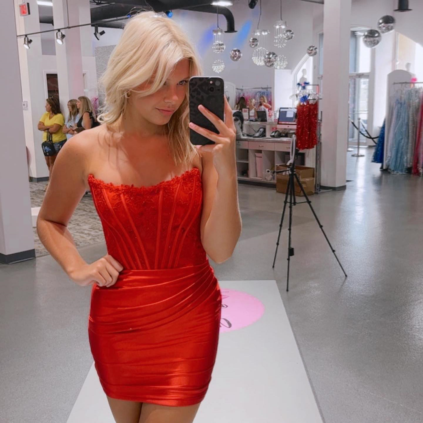 This red homecoming dress features a strapless neckline, a corset bodice with floral embroidered appliques, and a short-length skirt with ruched detail.