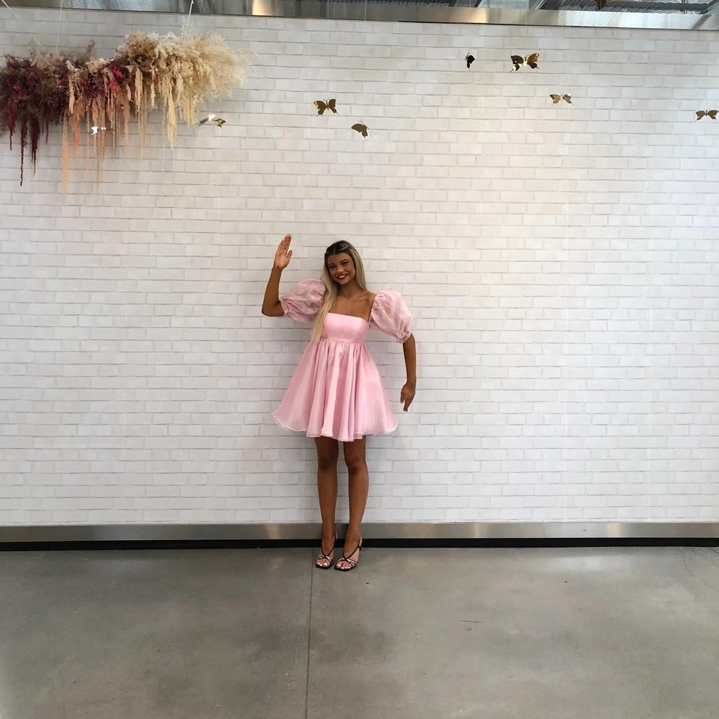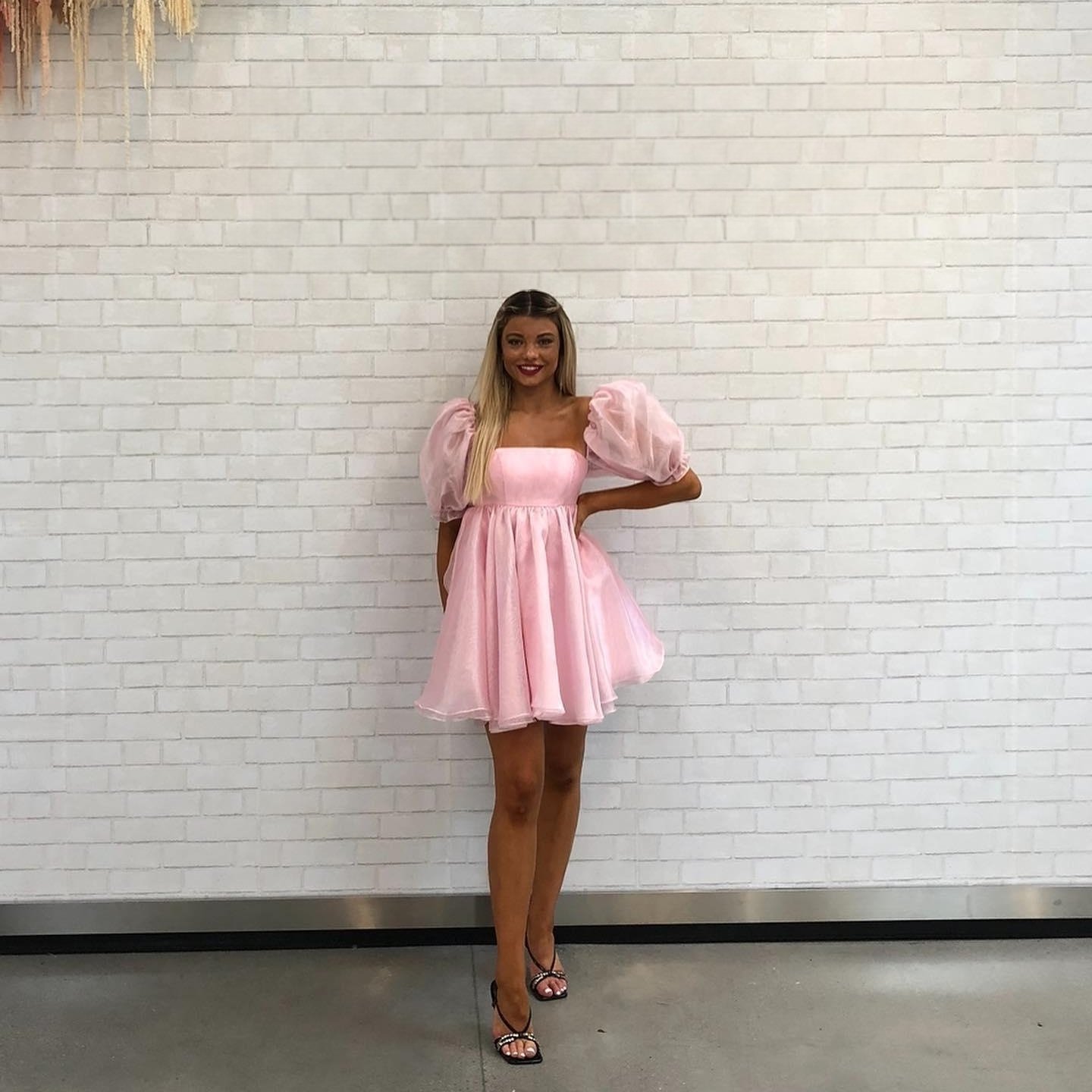 This pink homecoming dress features illusion short puff sleeves, an A-line silhouette, lace-up on the back, and a gathering short-length skirt.