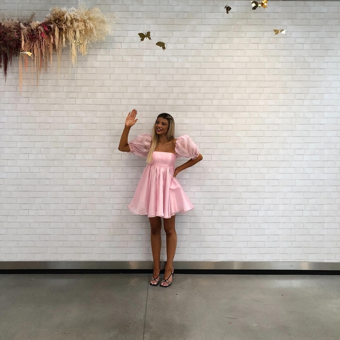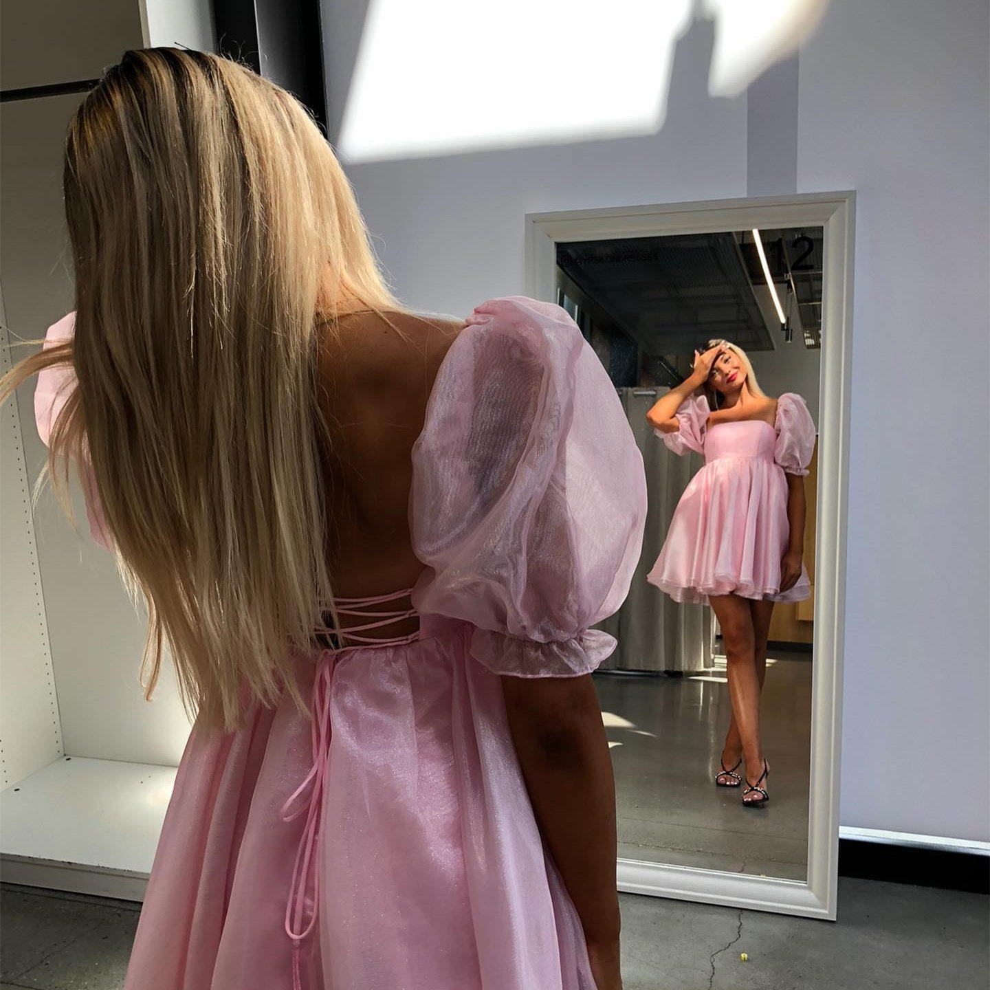 Pink Puff Sleeves A-line Lace-Up Homecoming Dress