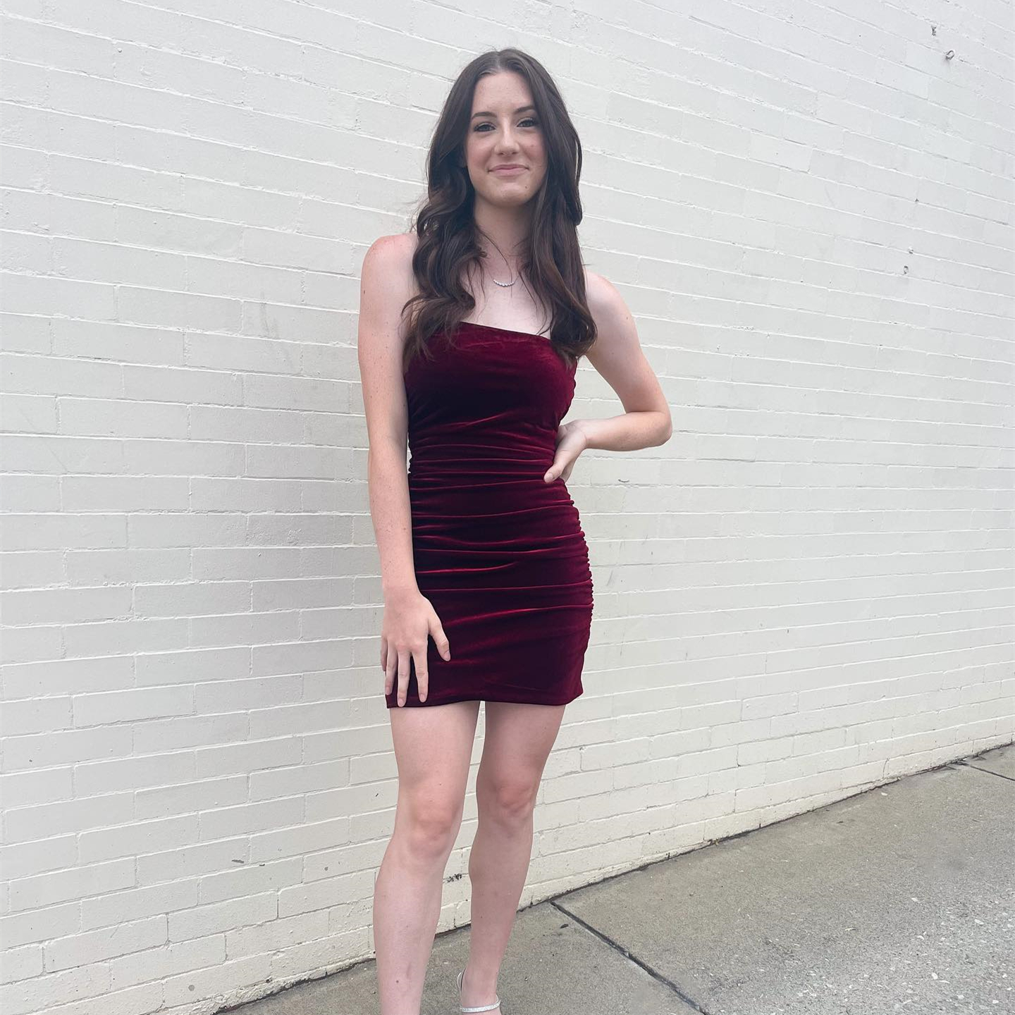 This burgundy homecoming dress features a strapless neckline, and a sheath silhouette.