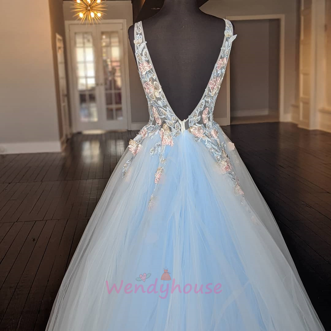 Princess blue A-line long prom dress with v neckline and mesh insert, so your breast part is safe. Floral embrodery makes the dress outstanding and special. Open back will show your back skins.