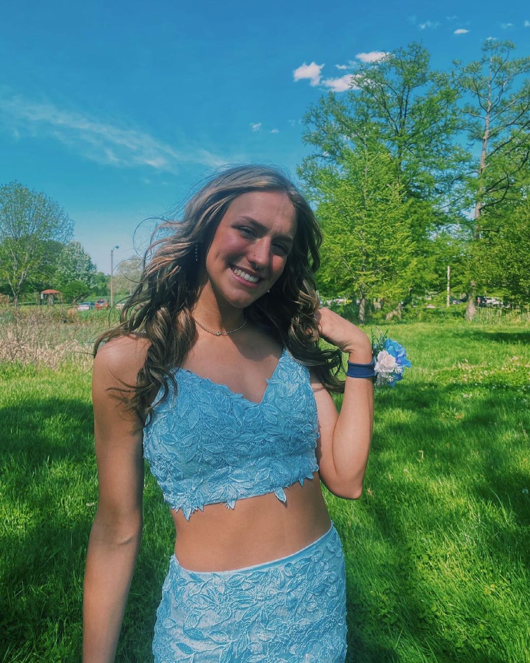 Light Blue Lace Appliques Two Piece Long Prom Dress