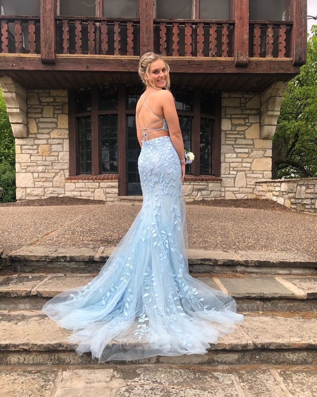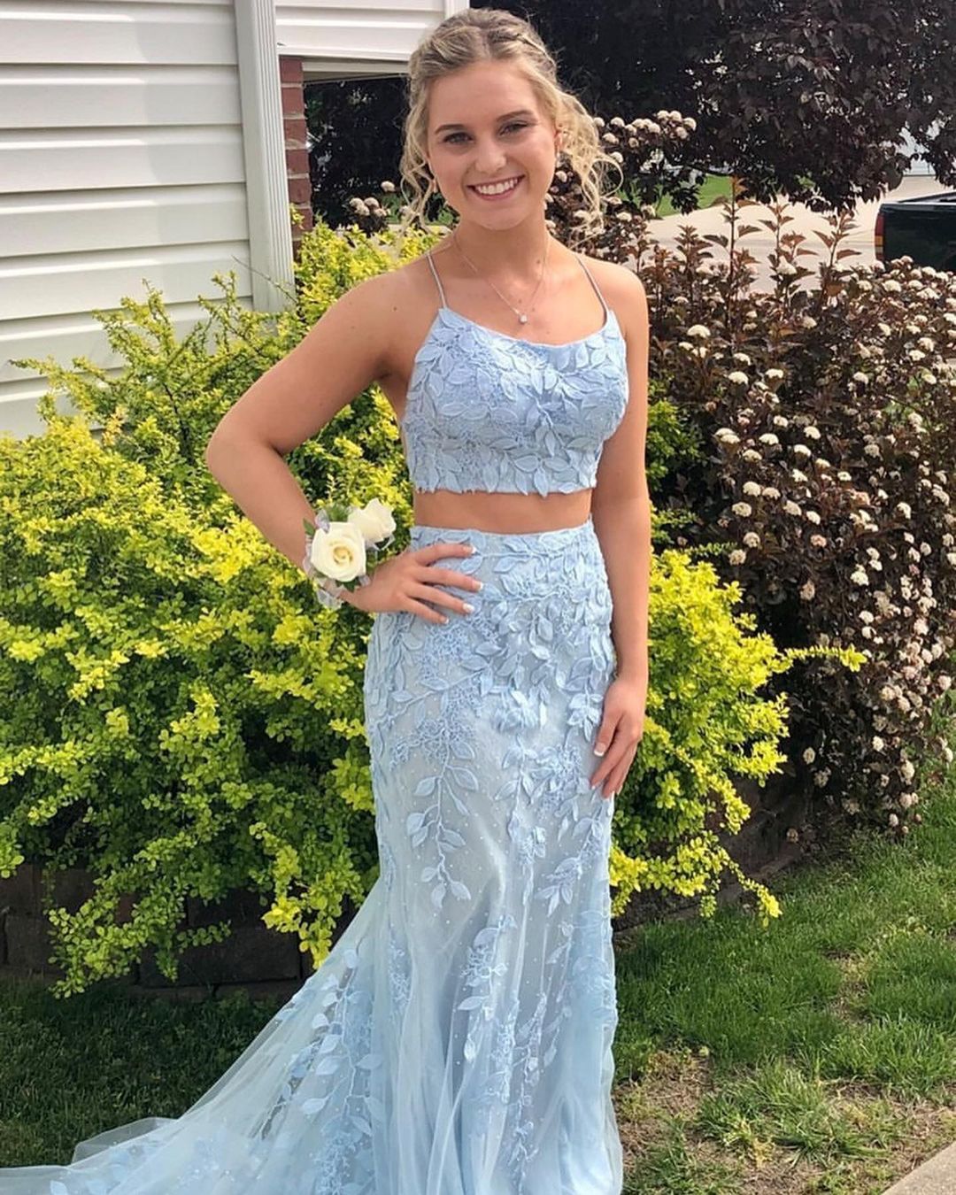 Wendyhouse two piece light blue mermaid lace appliques long prom dress.