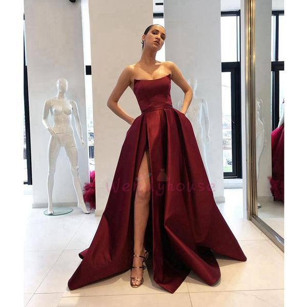 Burgundy Strapless Front-Split Long Prom Dress with Pockets