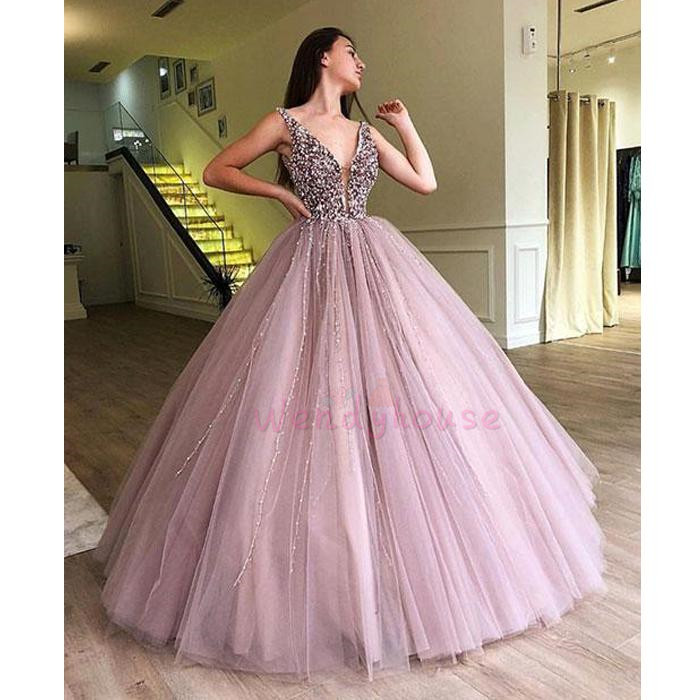 Luxurious Dusty Pink V Neck Long Prom Dress,Ball Gown Evening Formal Dress