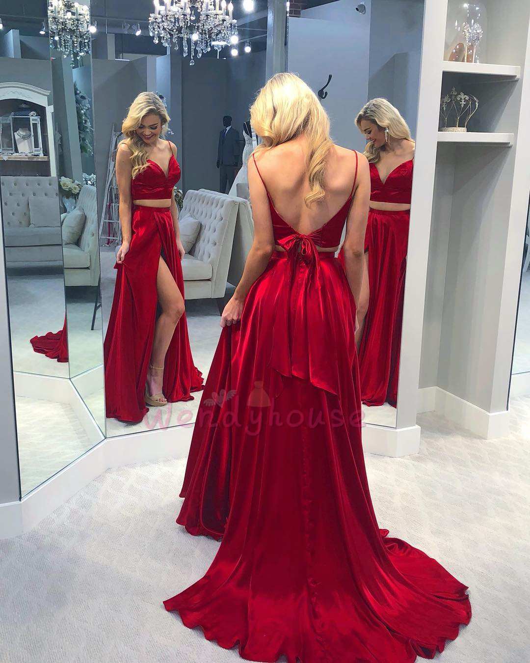 Two Piece Red Front-Slit Long Prom Evening Dress