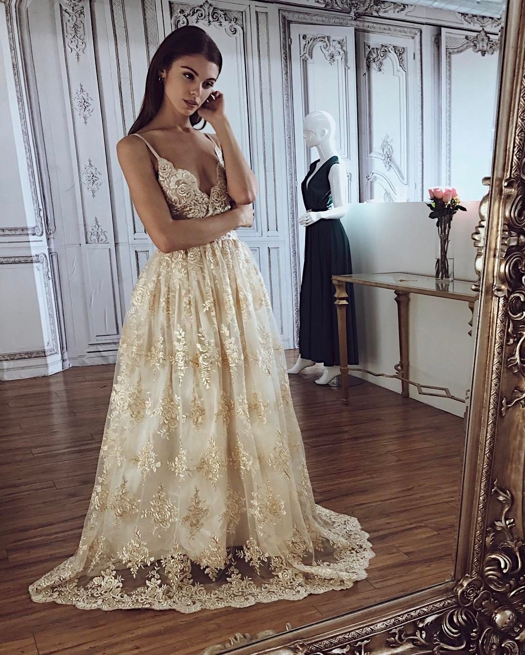 Gold Long Wedding Dress,,Spaghetti Straps Long Wedding Dress