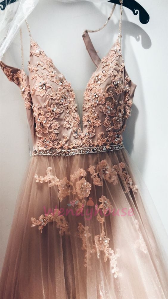 Wendyhouse blush long prom dress forms in A-line silhouette with floral lace applqies and sequins.