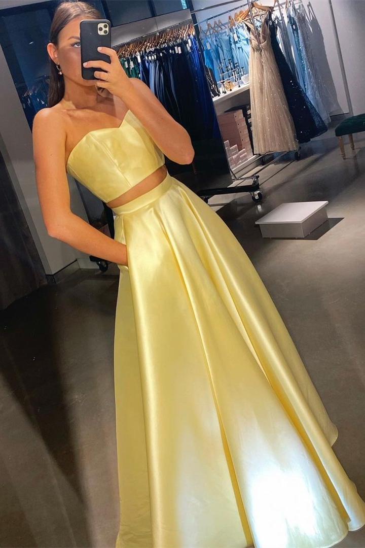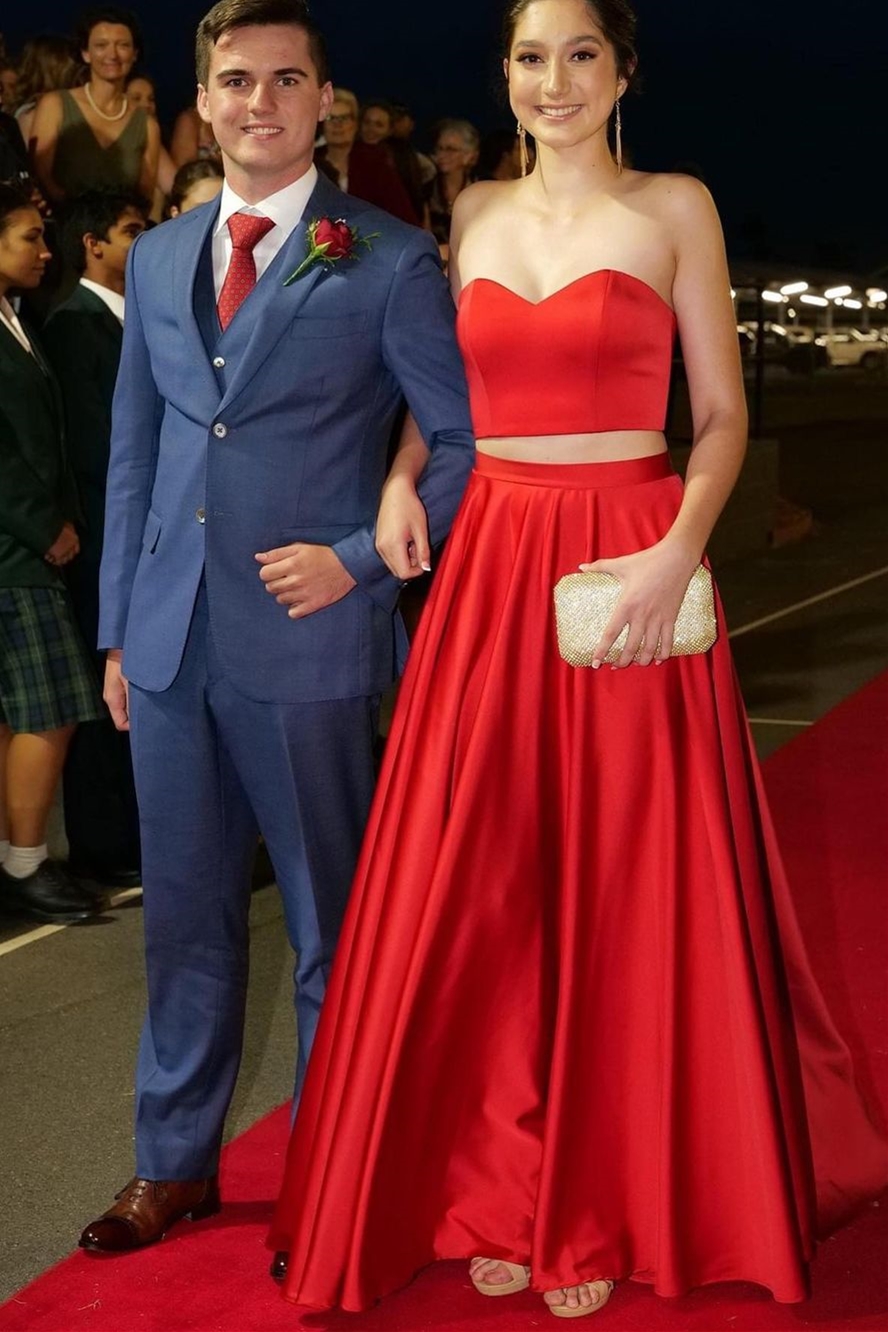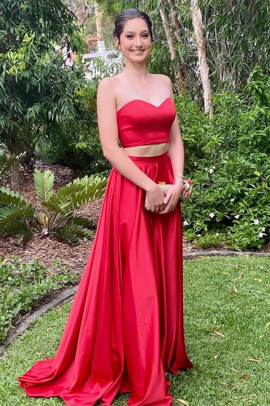 Wendyhouse two piece red long prom dress features with sweetheart top and pockets in side.