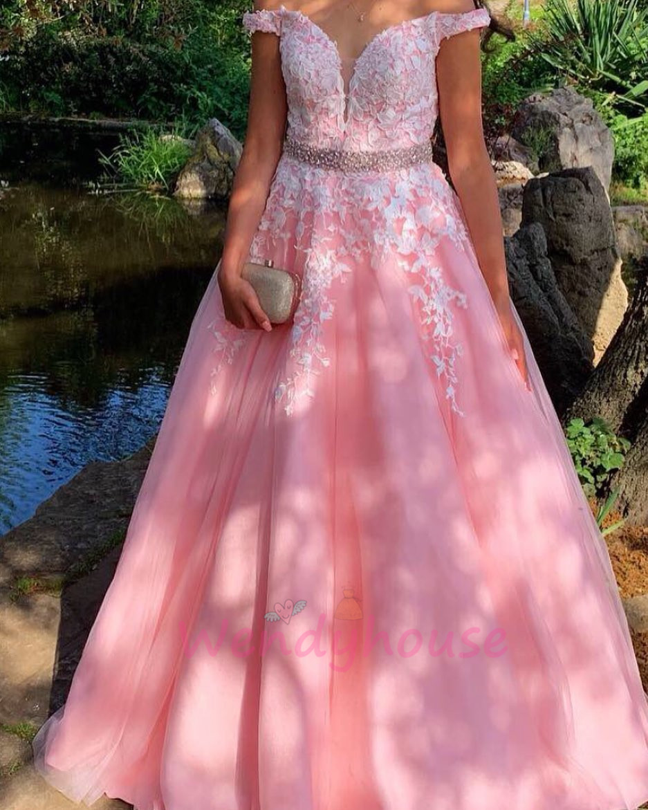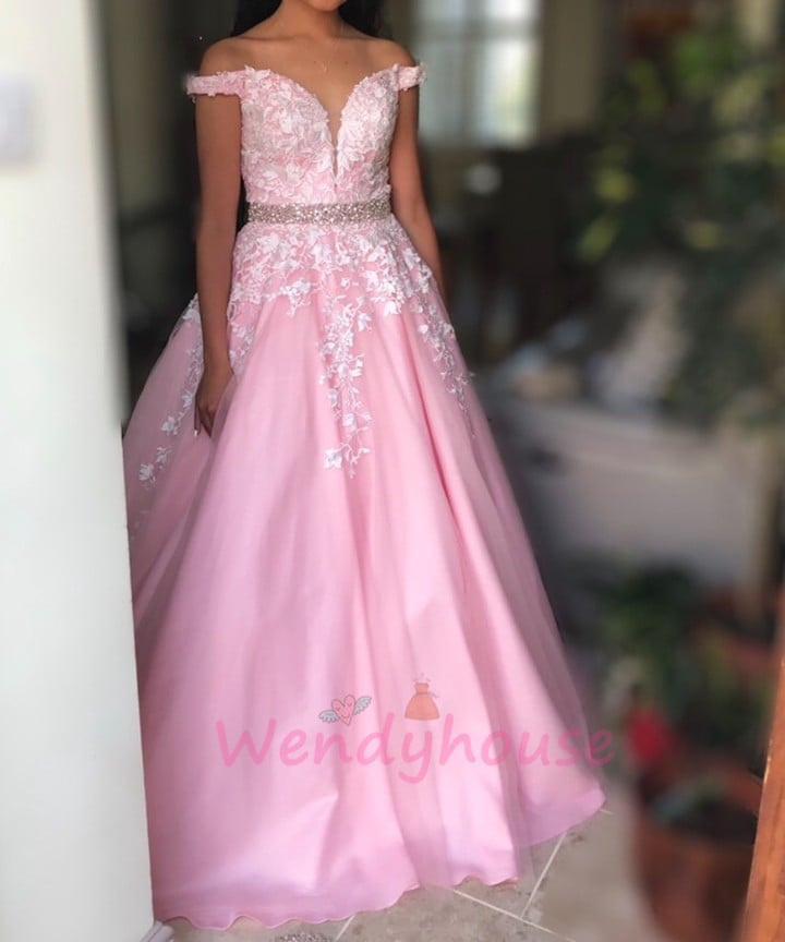 2020 pink long prom dress with off the shoulder neckline, lace appliques and beaded belt.
