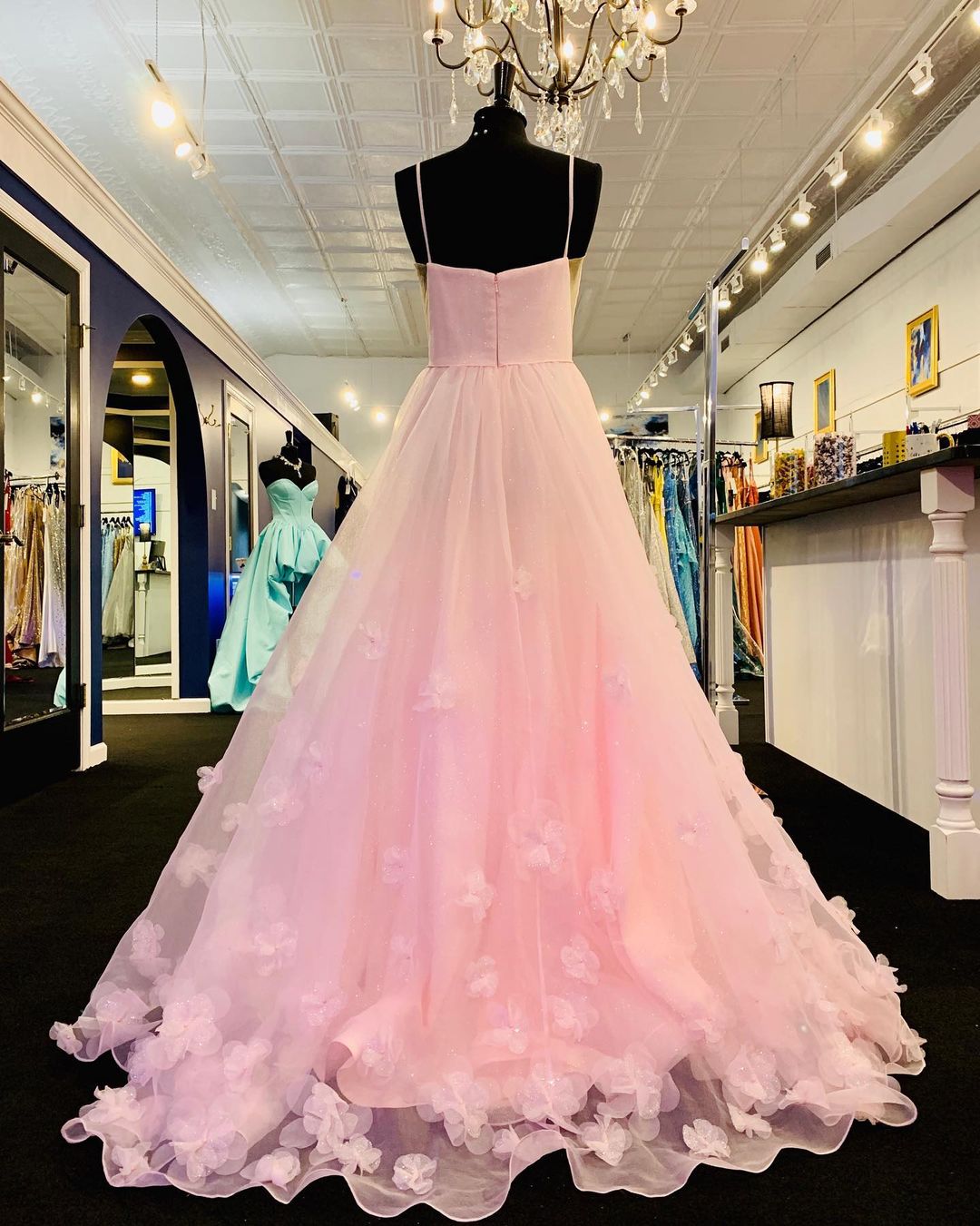 Wendyhouse pink ball gown for 2020 prom with spaghetti straps, and details on the bottom. You can also buy the dress for your sweet 16, winterformal.