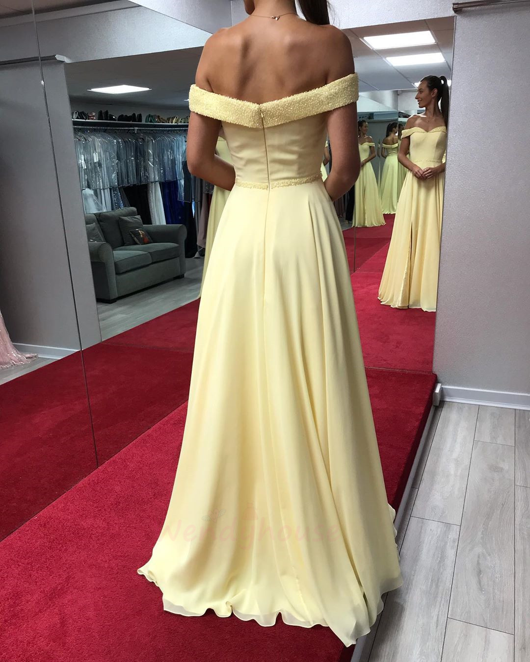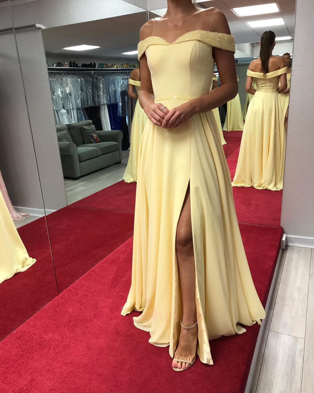 Wendyhouse yellow long prom dress with off the shoulder neckline, floor length and side slit.