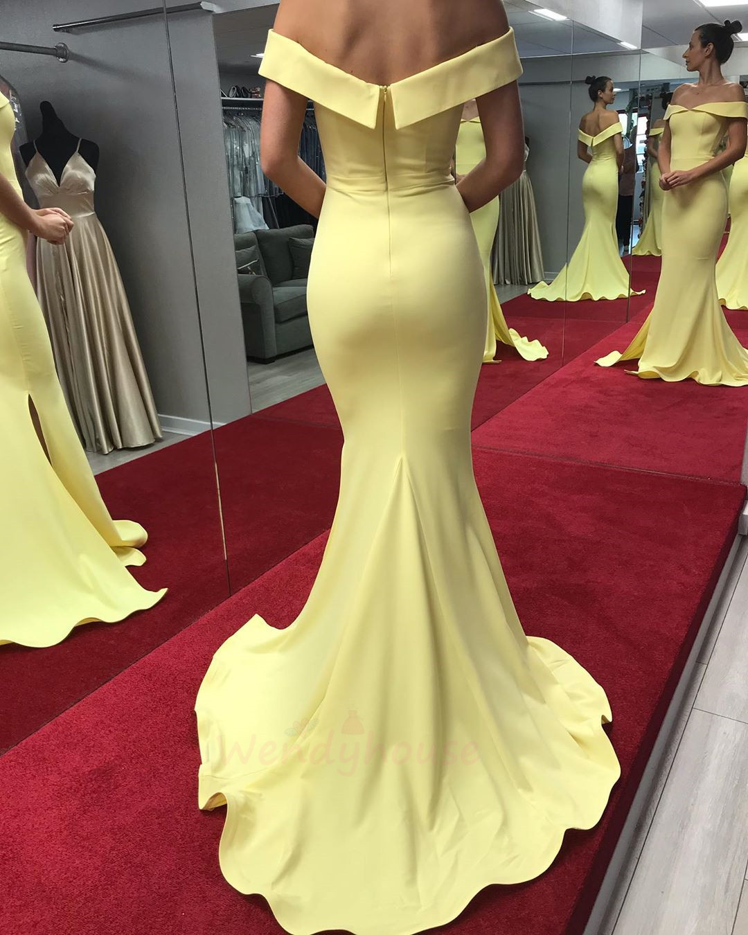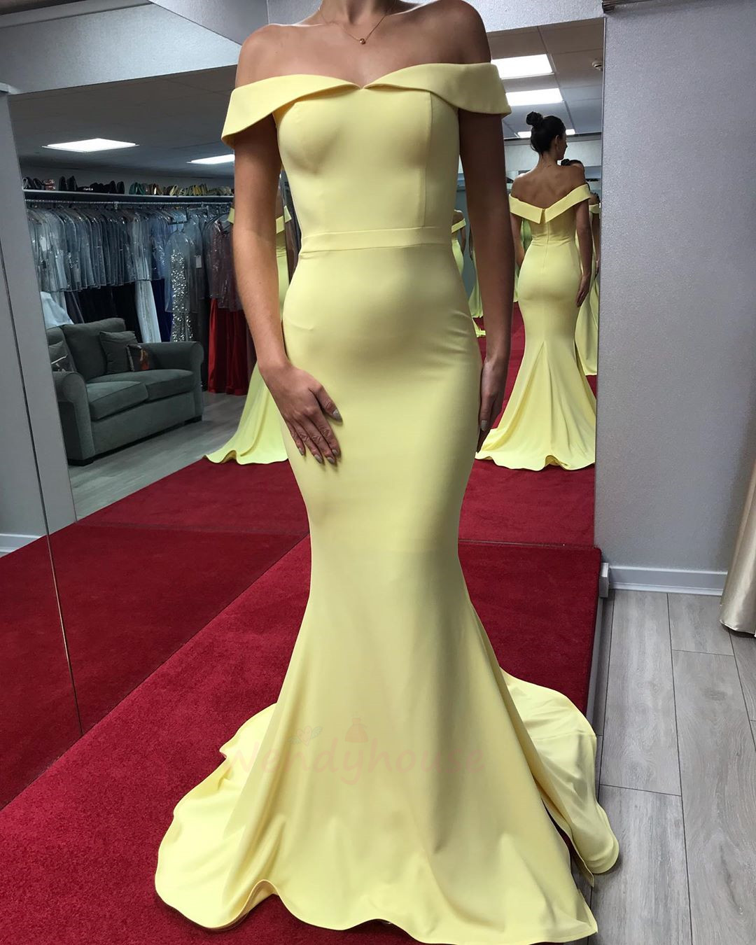 Wendyhouse yellow long formal dress features with mermaid silhouette and off the shoulder neckline.