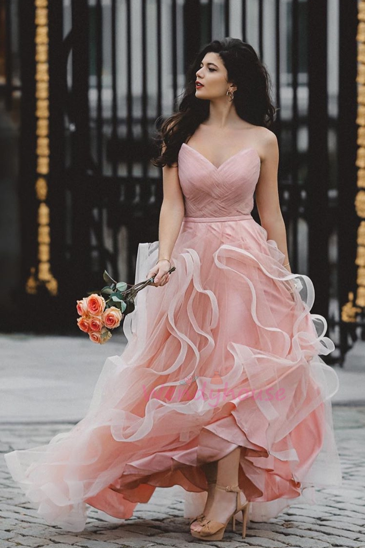 Romantic pink formal gown with strapless neckline, ruffled skirt and floor length long.
