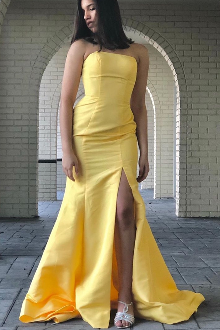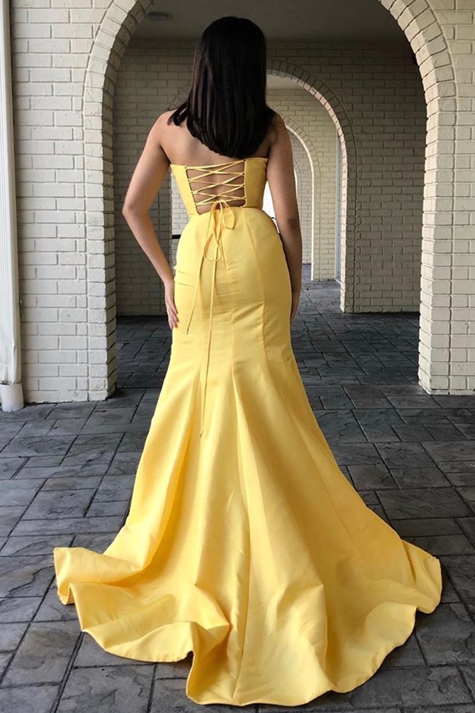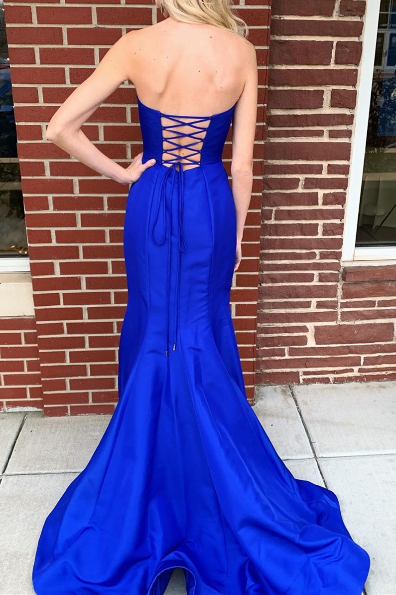 Simple royal blue prom dress features mermaid silhouette, strapless neckline, lace up back and floor length long.