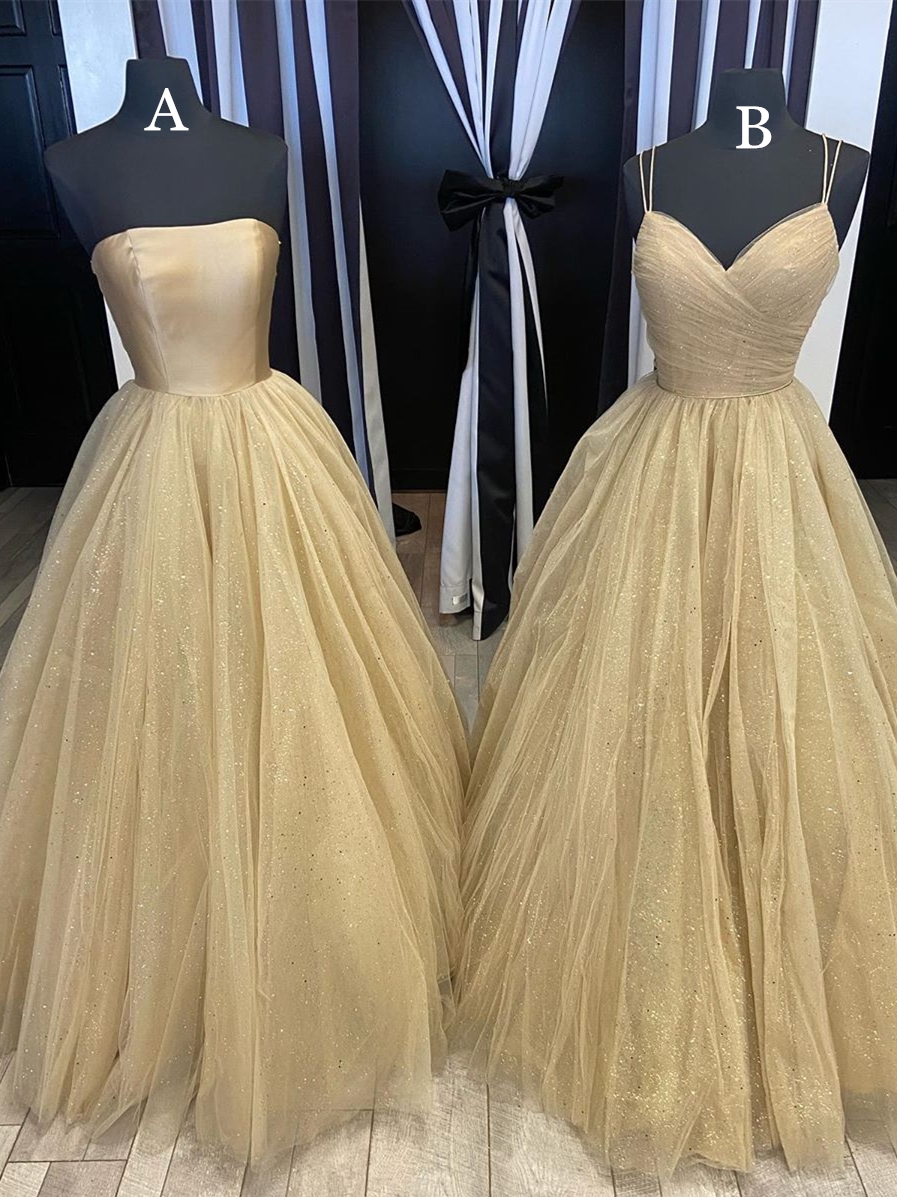 Gold balll gown with gliiter floor length skirt. A is strapless gold ball gown, B gold ball gown with spaghetti straps and pleasted bodice. Both dresses are zip up!!!