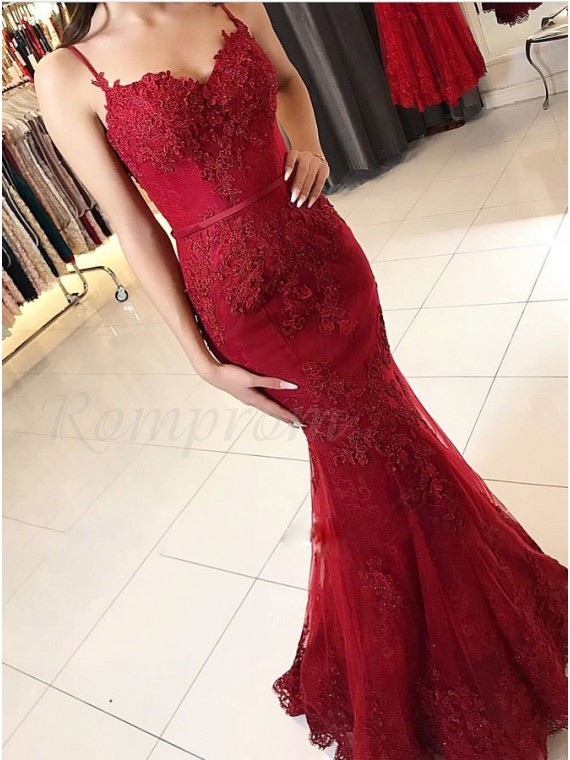 Gorgeous mermaid red evening dress with spaghetti straps, lace appliques and floor length long.