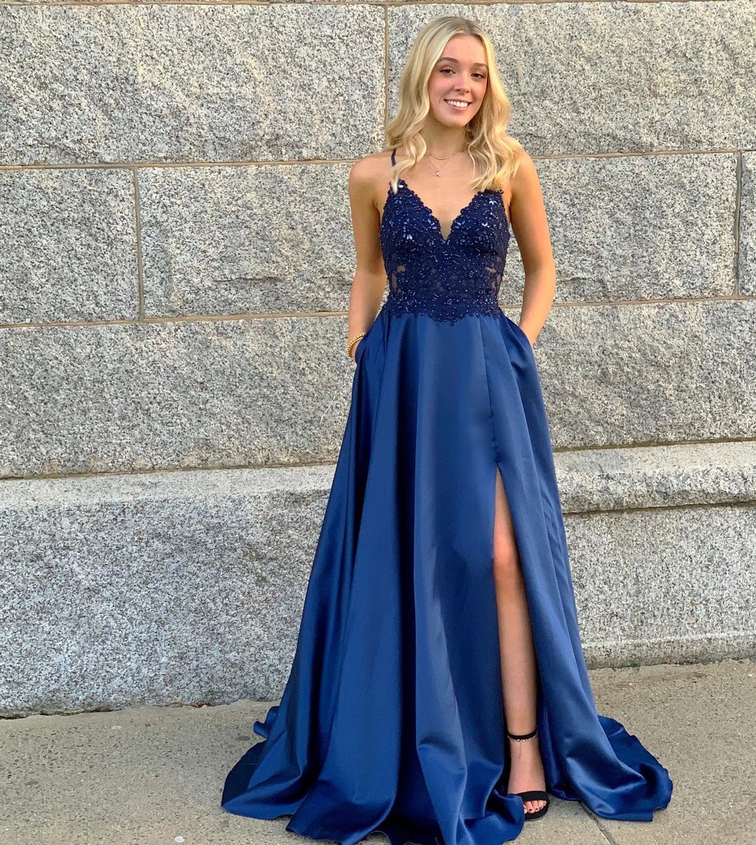 Wendyhouse navy blue A-line satin long prom dress with pockets.