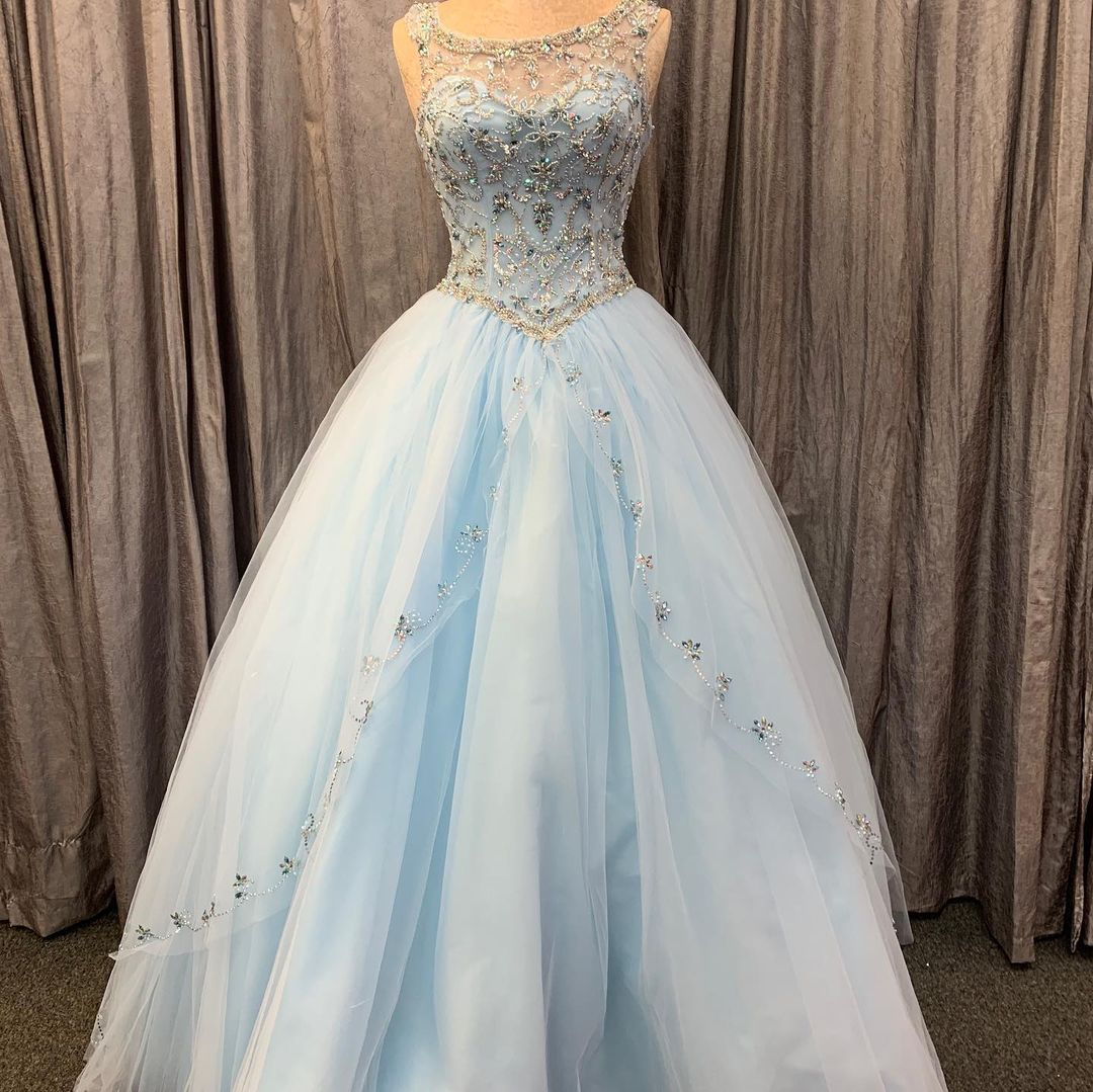 Princess Light Blue Beaded Tulle Long Quincerean Dress