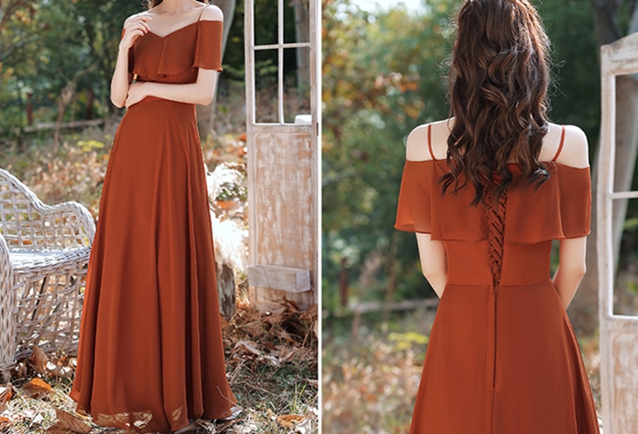 Wendyhouse rust orange chiffon long bridesmaid dress with straps and lace up back.