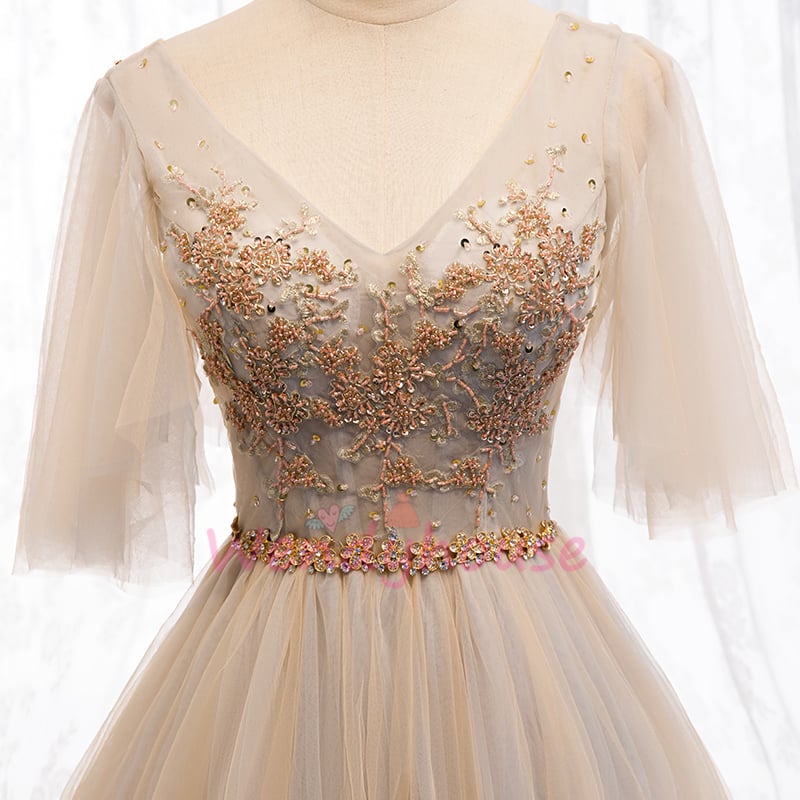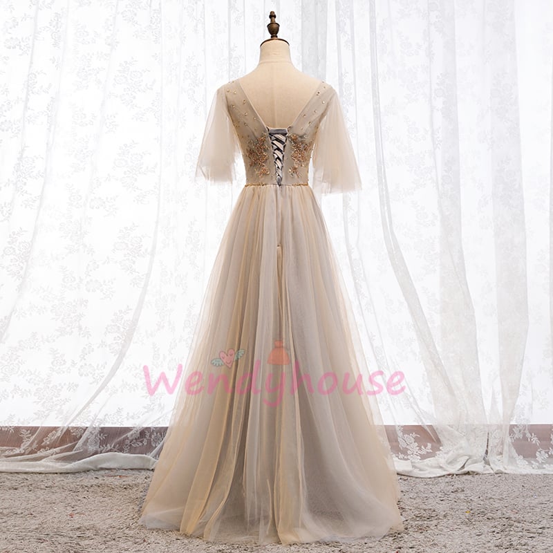 Wendyhouseprincess A-line champagne long prom dress with beaded bodice and flutter sleeves.