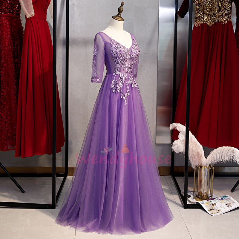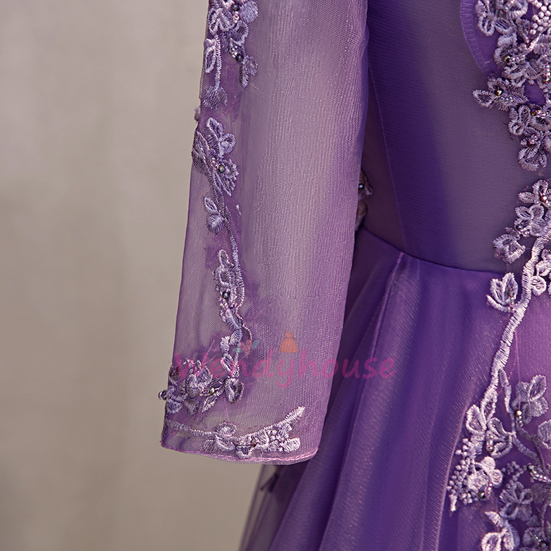 Wendyhouse short sleeves lilac long evening dress features with lace appliques and lace up back.