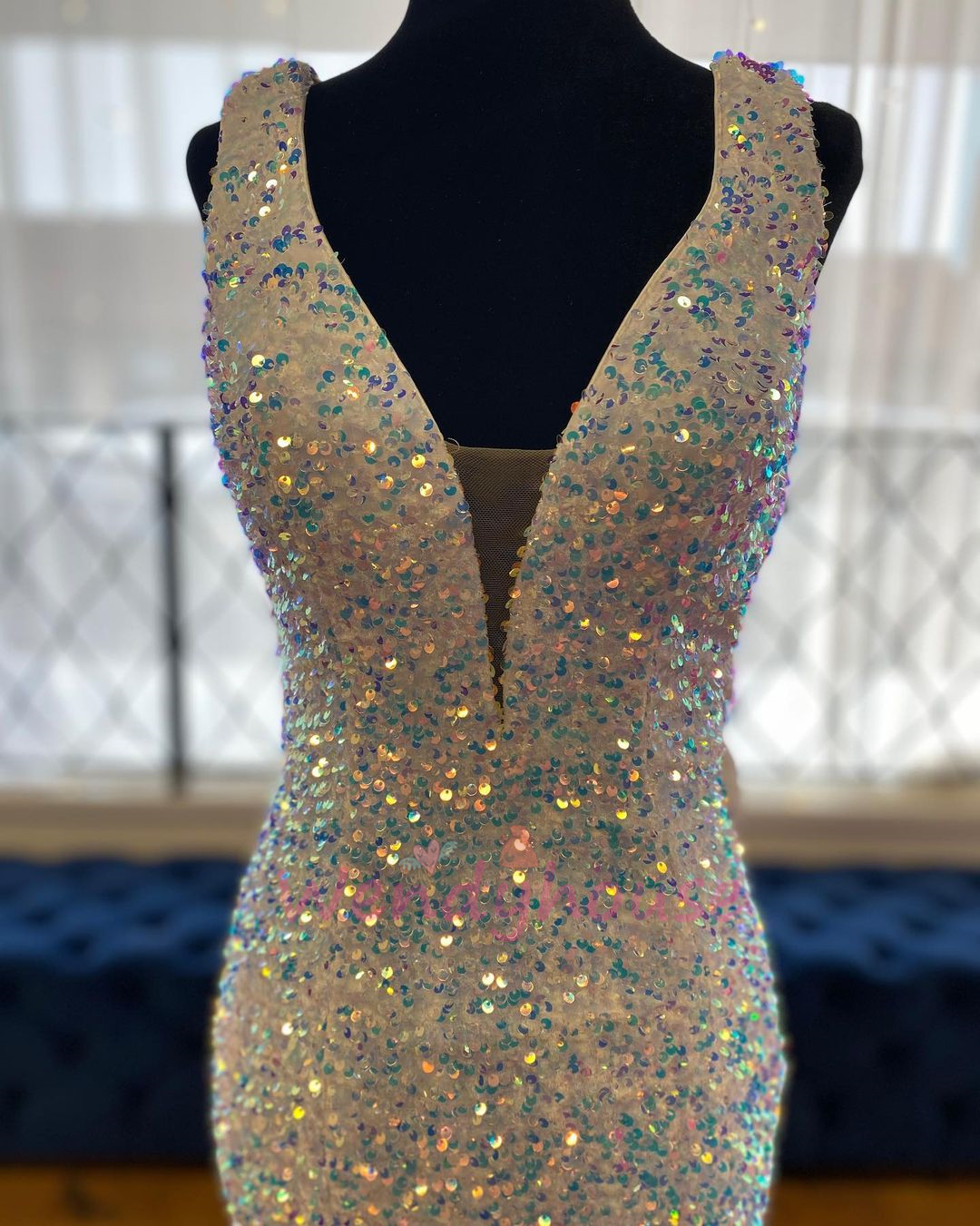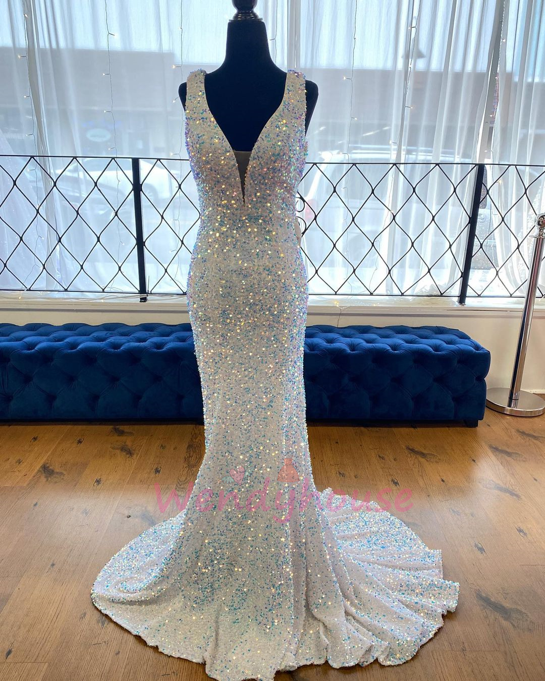 Wendyhouse sparkle white and blue seequined long formal dress features with mesh insert neck and see sheer back!