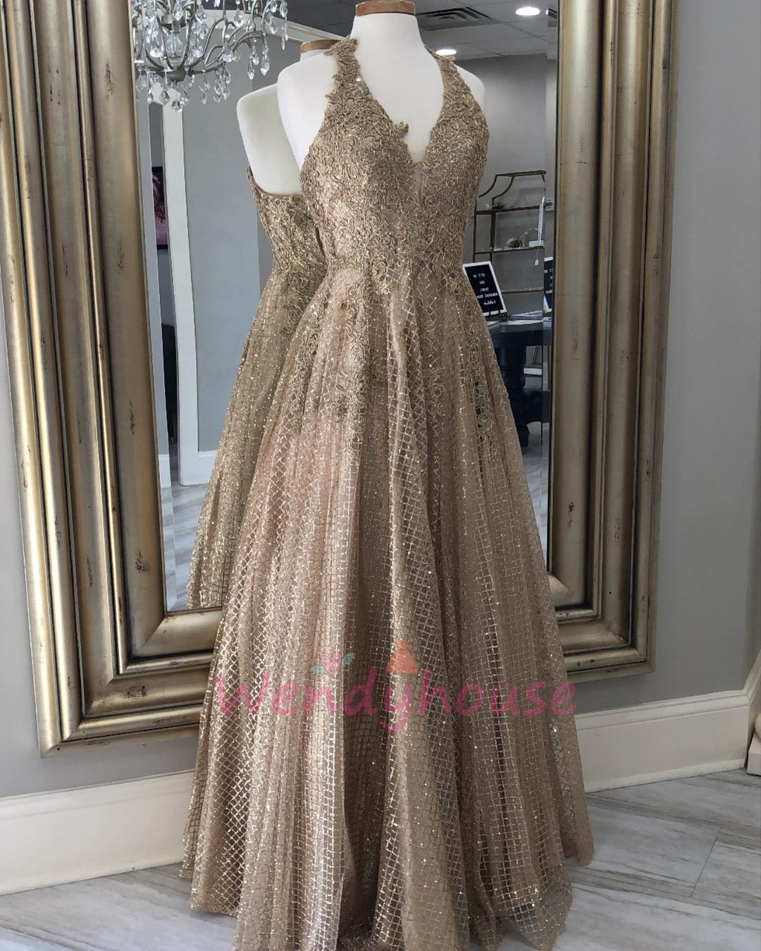 Wendyhouse elegant 2021 gold long formal dress with halter neckline and open back.