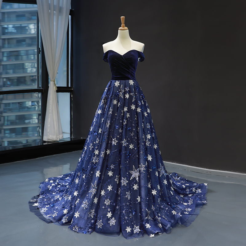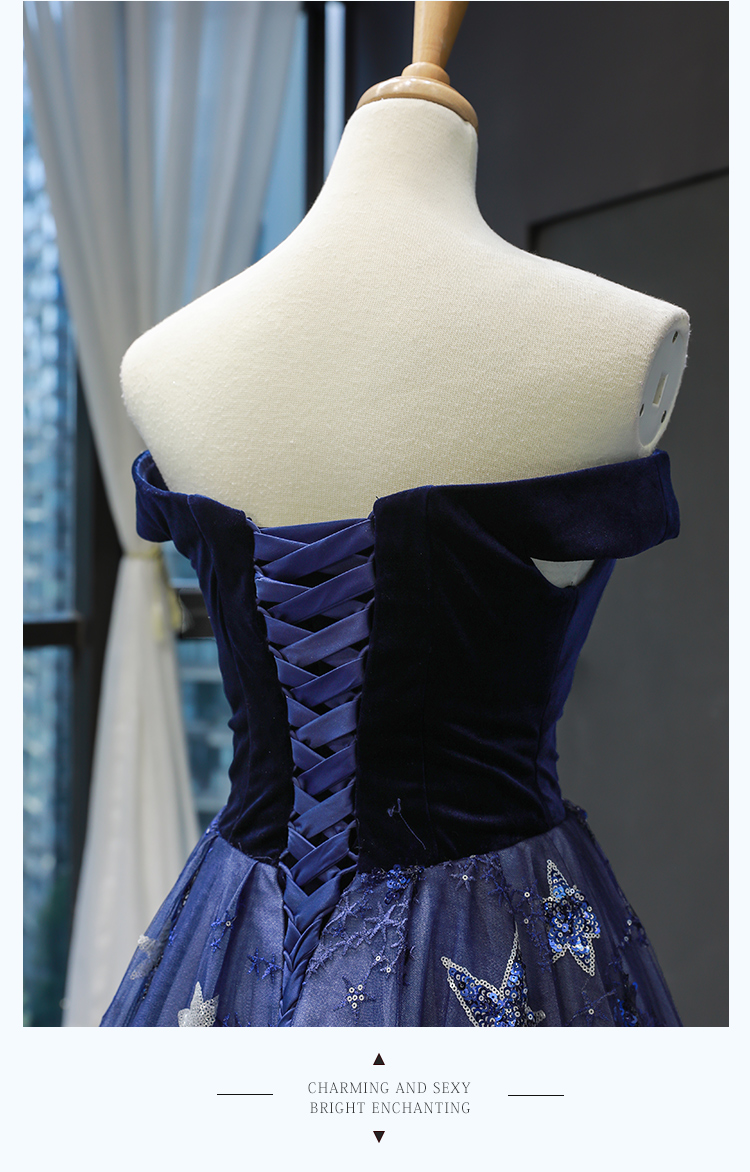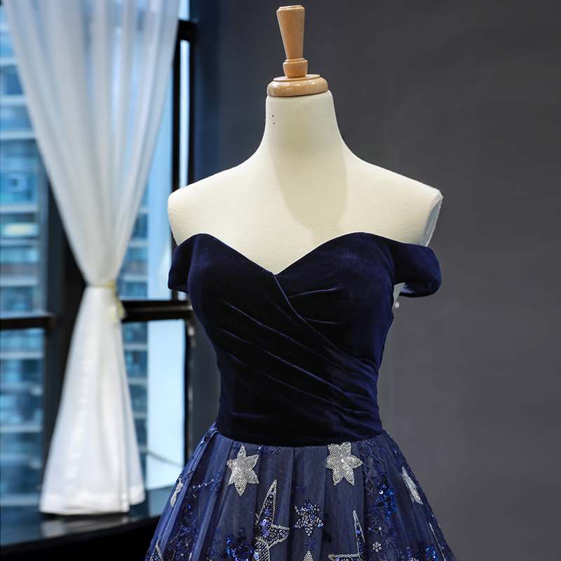 Wendyhouse off the shoulder navy blue prom dress with velvet top.