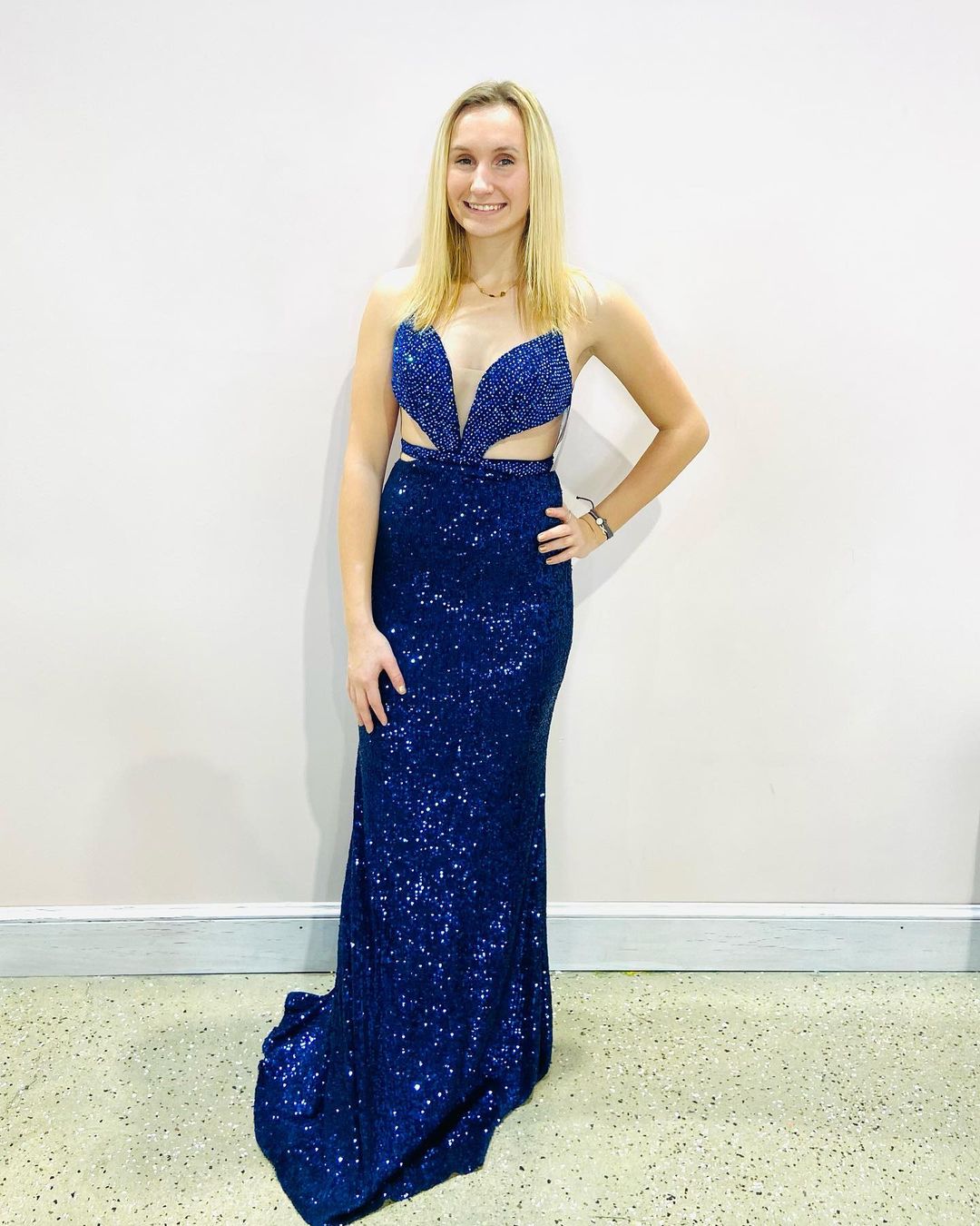 Wendyhouse sexy mermaid navy blue sequined long party dress with open back.