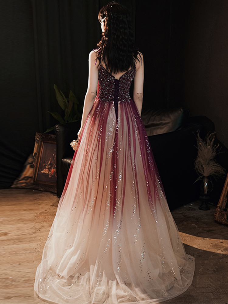 Straps A-line Ombre Burgudy Tulle Long Formal Dress