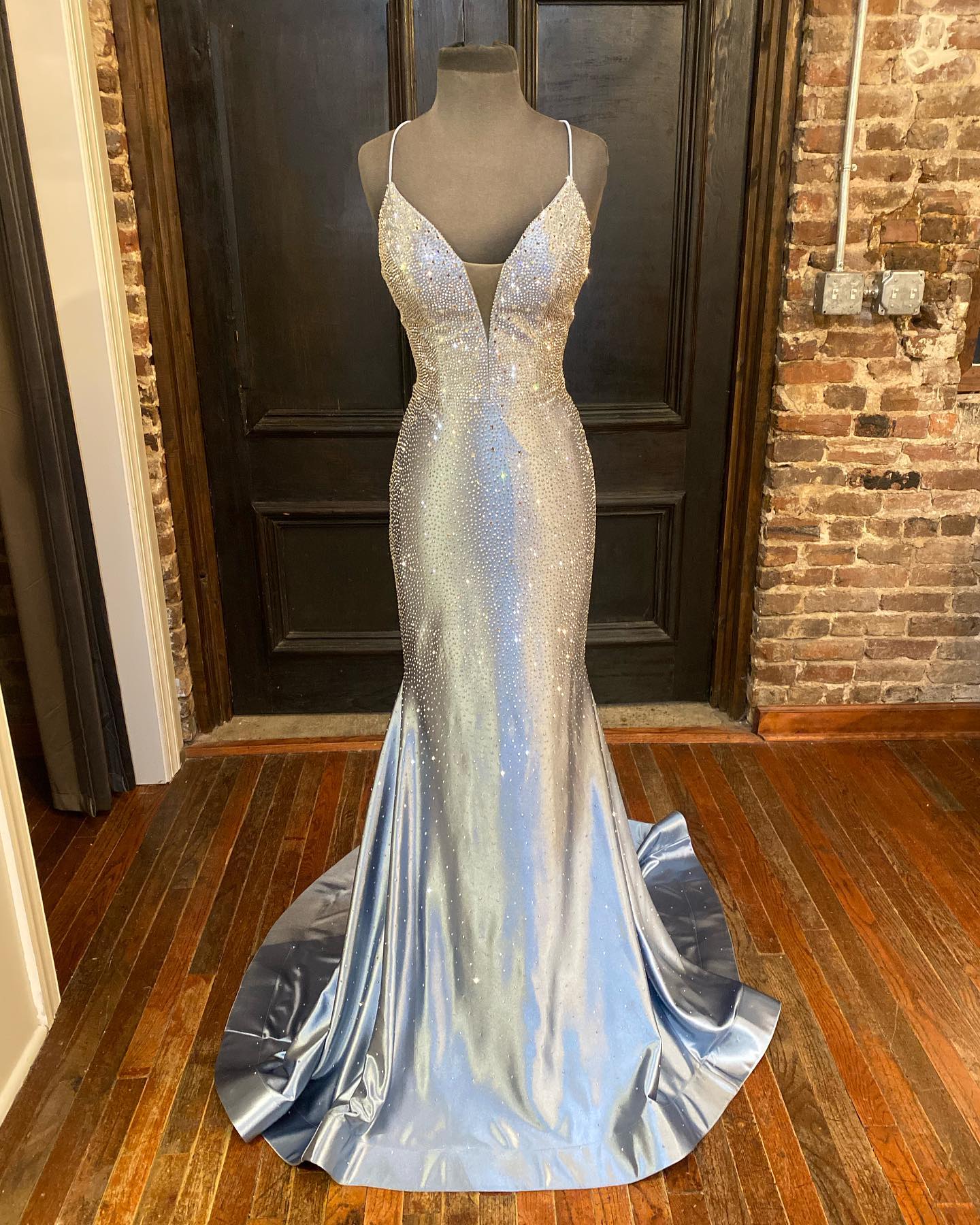Wendyhouse mermaid silver long prom dress features with spaghetti straps, v neck and lace up back.