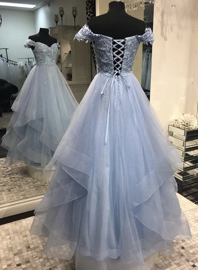 Wendyhouse princess light blue long prom dress features appliques off the shoulder bodice with lace up back.