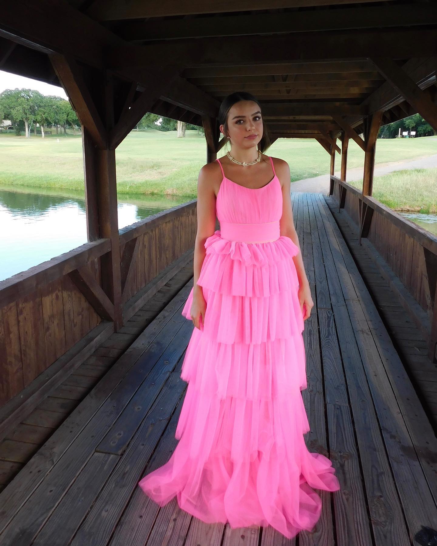 Pink Spaghetti Straps Tiered Long Formal Dress
