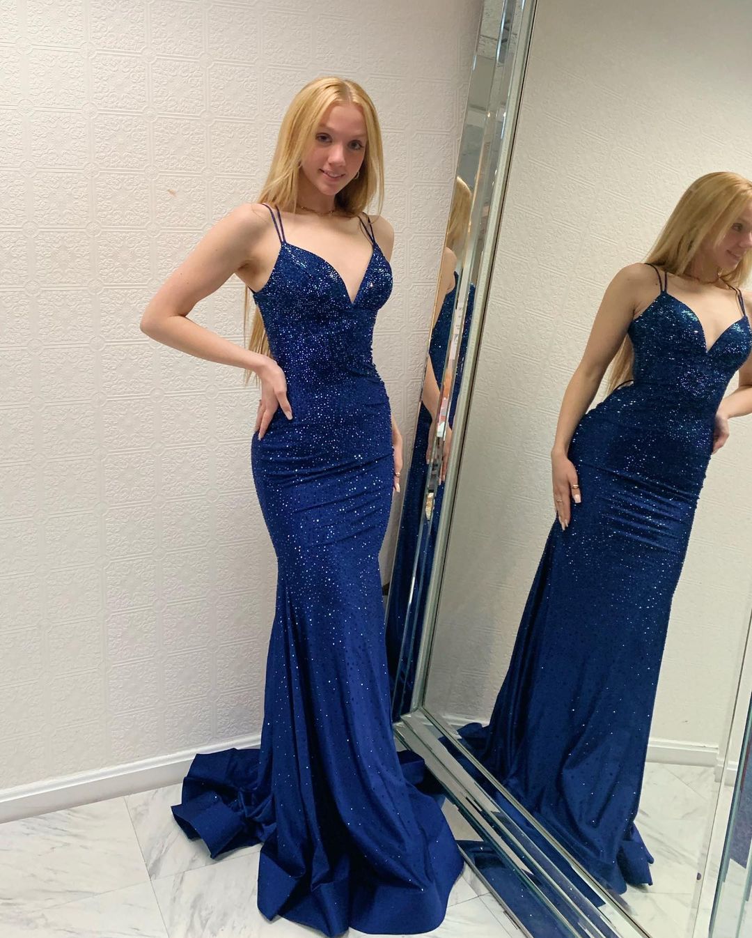 Gorgeous mermaid navy blue formal dress with beads, spaghetti straps and lace up back.
