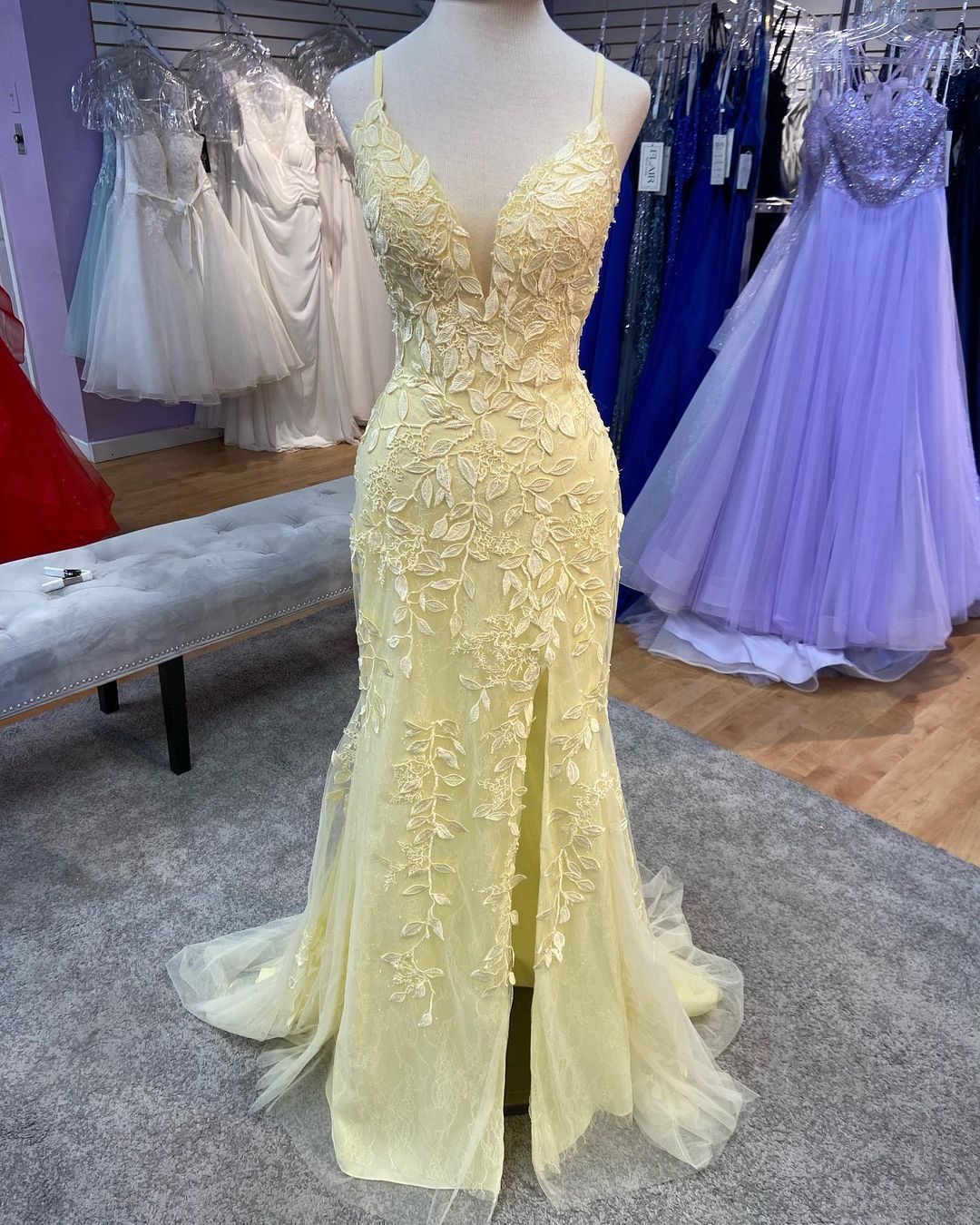 Elegant mermaid yellow lace appliqued long prom dress features spaghetti straps, v neck, side slit and lace up back.