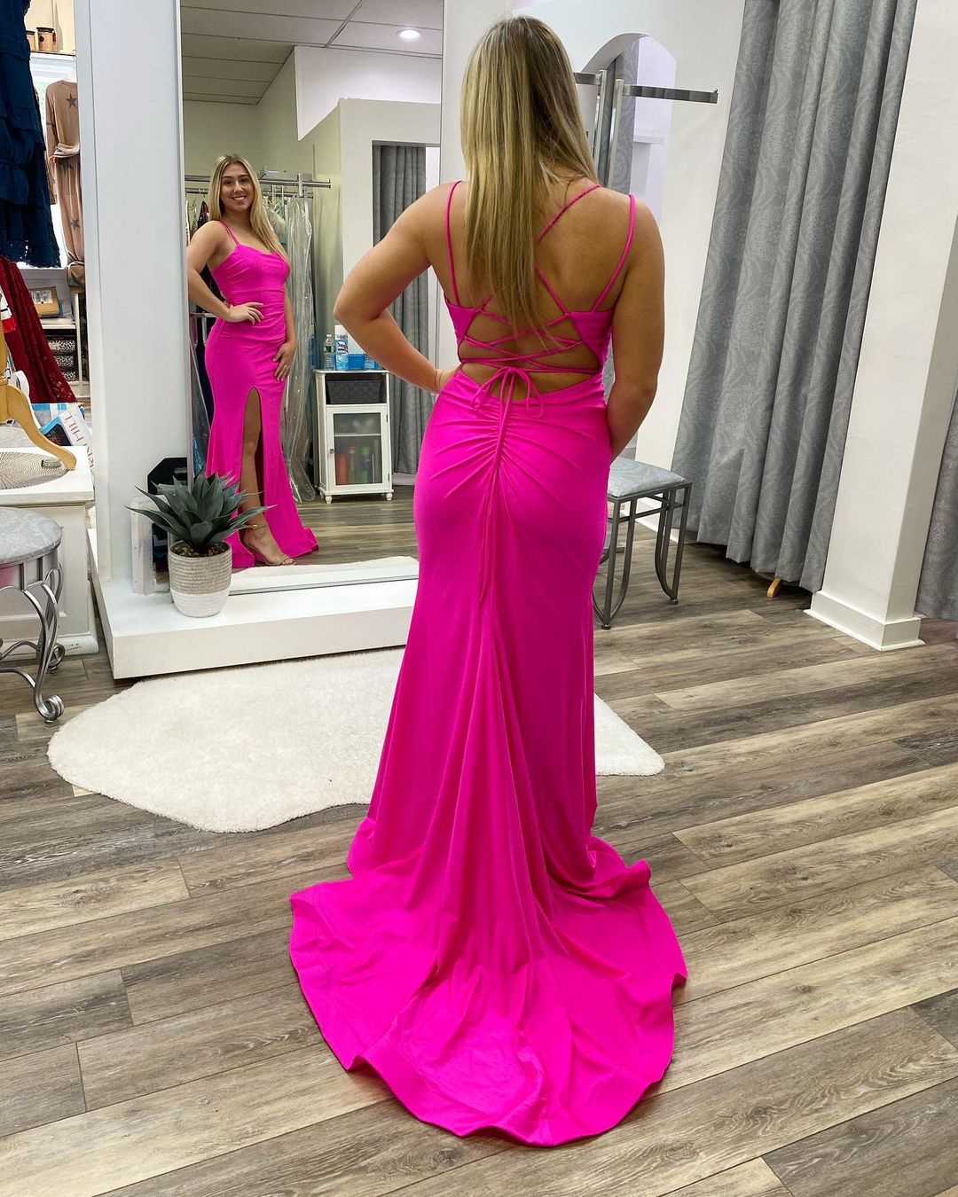Simply elegant neon pink mermaid long formal dress with spaghetti straps, side slit and lace up back.