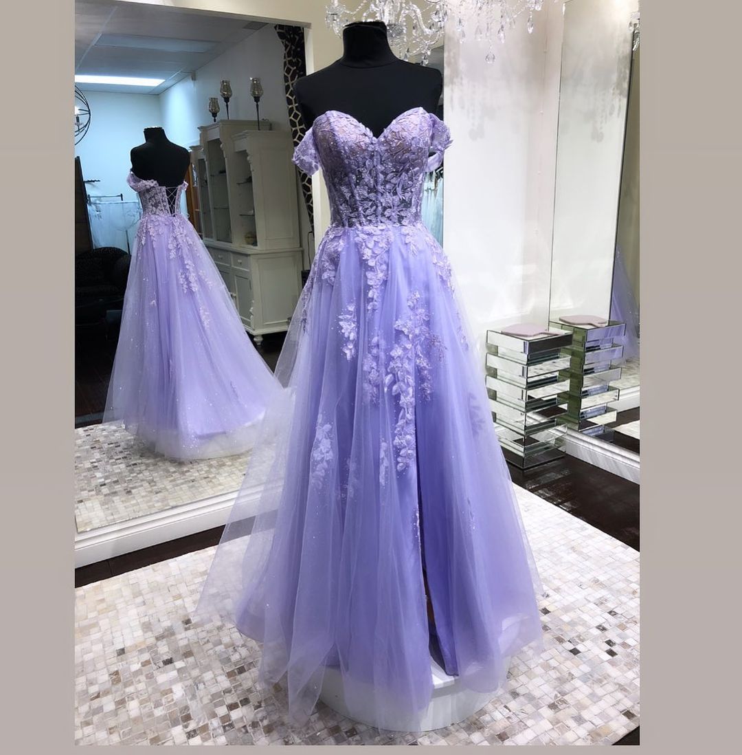 Princess lavender A-line long prom dress with off the shoulder neck and lace up back.