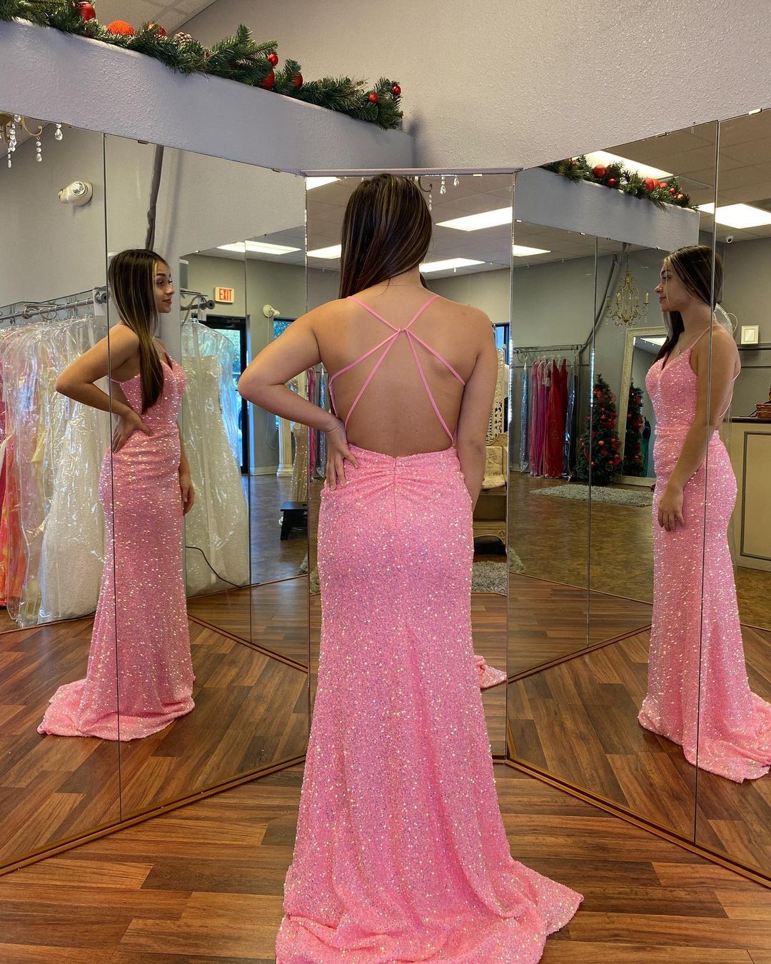 Stunning pink sequin mermaid long prom dress features spaghetti straps and cross back.