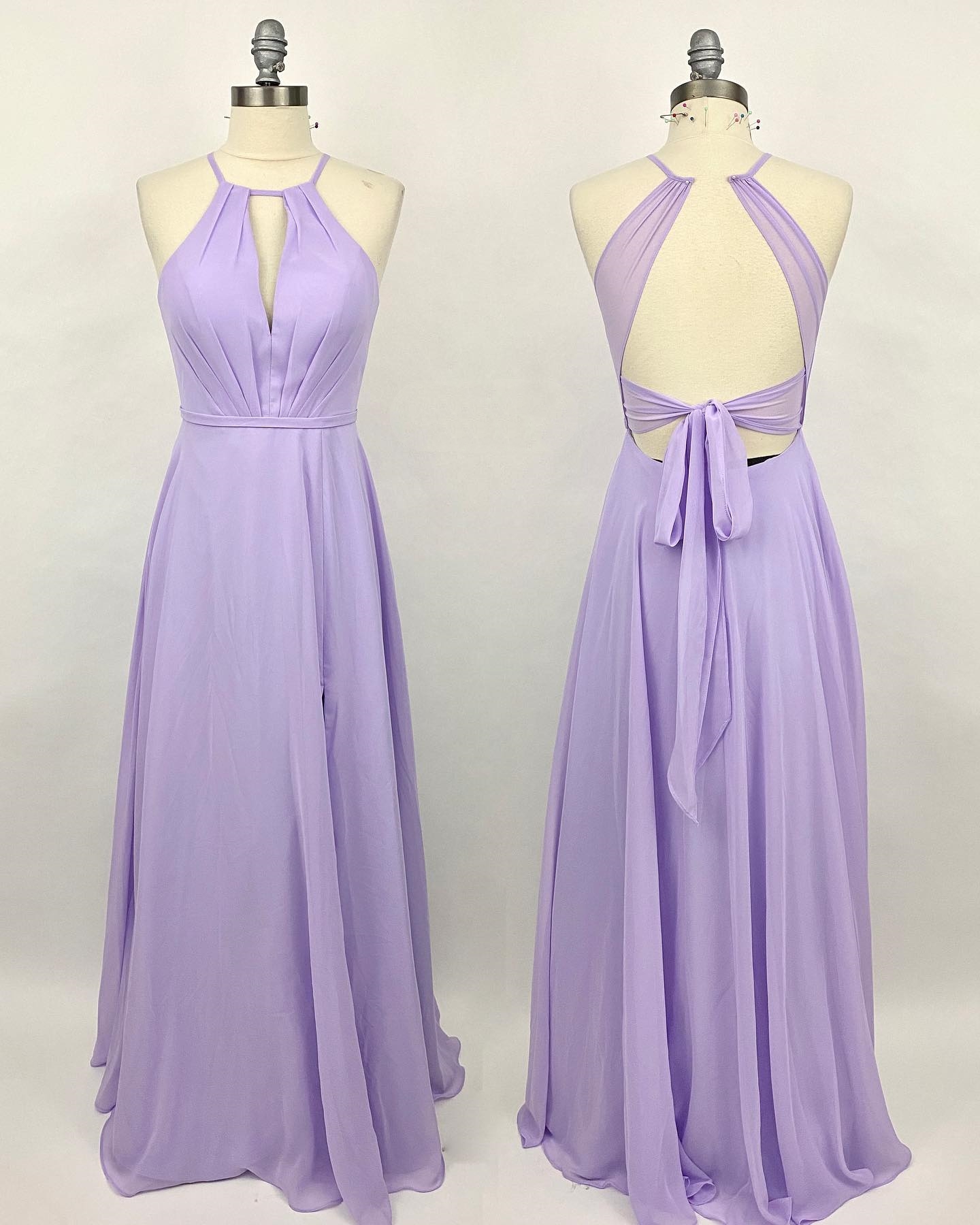 Wendyhouse princess lavender chiffon long bridesmaid dress features with halter neck, key hole and open back.