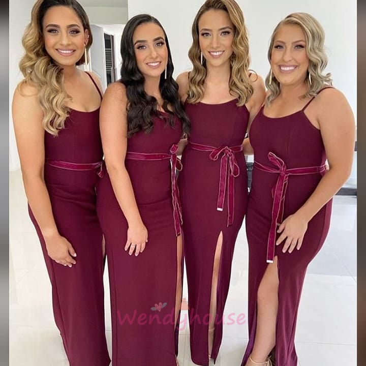 Maroon mermaid long bridesmaid dress with spaghetti straps, side slit and sash.