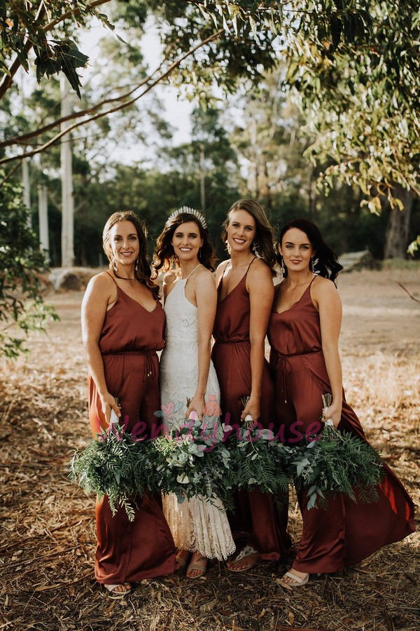 Wendyhouse dusty orange long bridesmaid dresses with spaghetti straps and tie waist.