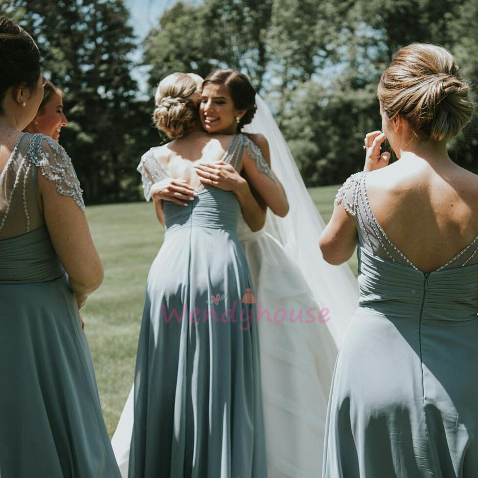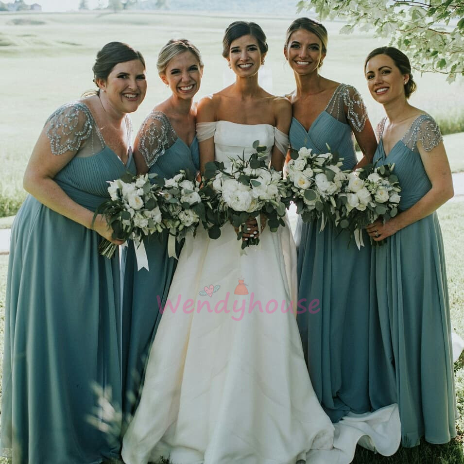 Gorgeous Cap Sleeves Blue Chiffon Long Bridesmaid Dress