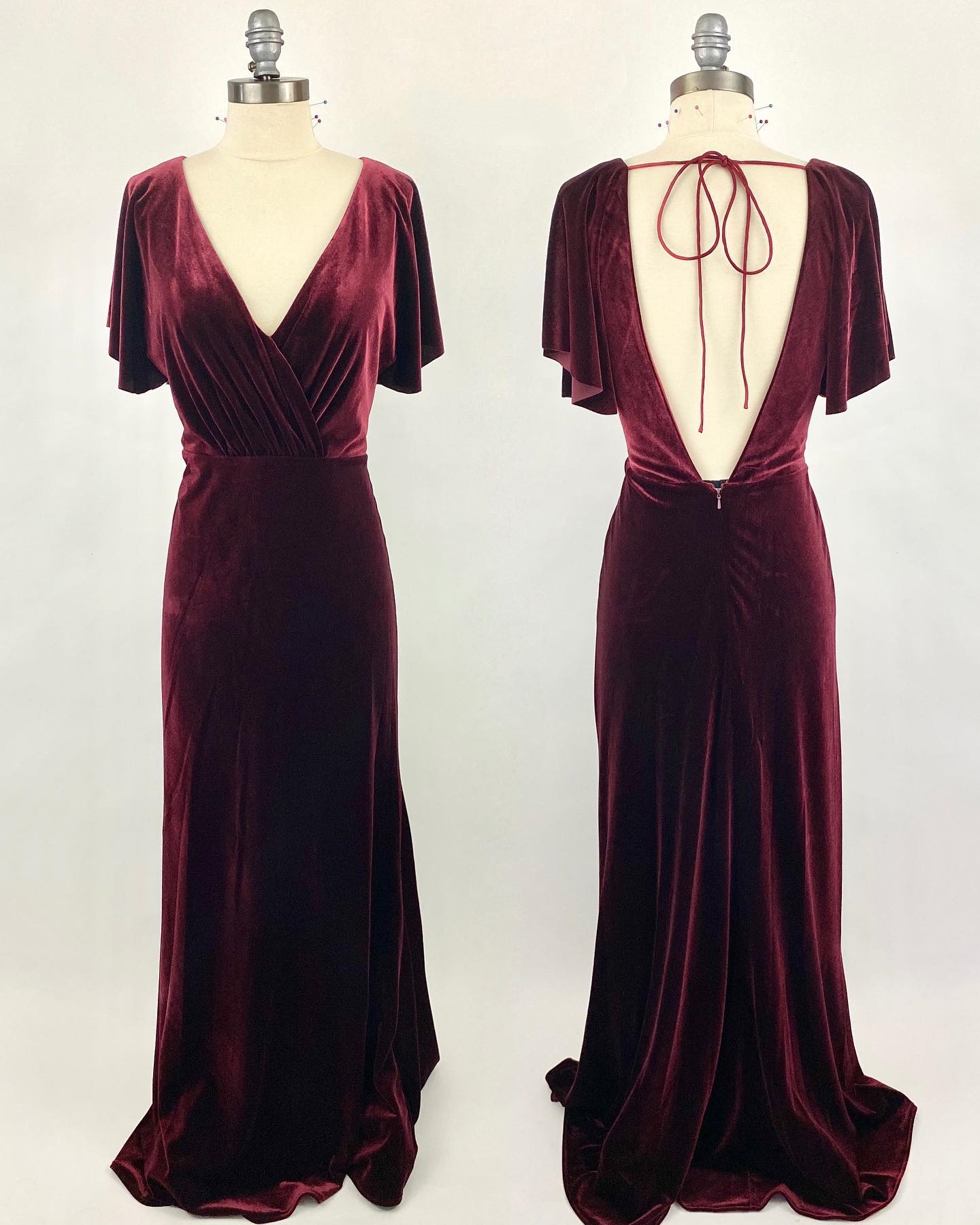 Wendyhouse wine red velvet A-line long bridesmaid dress features with flutter sleeves, v neck pleated bodice and open back.
