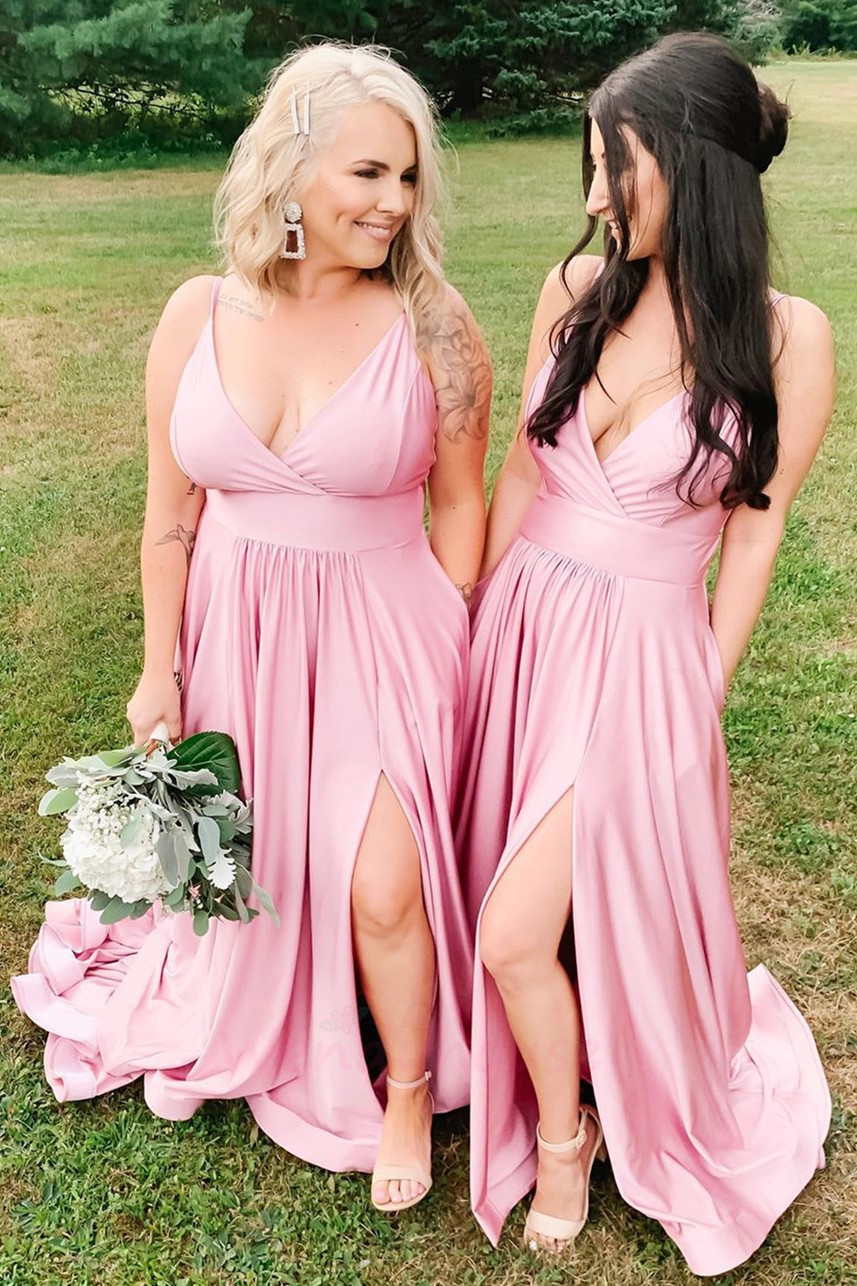 Wendyhouse floor length pink formal dress with deep v neckline, side pockets and slit.